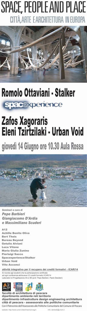 Il 14 giugno alle ore 10.30 presso l’aula rossa della Facoltà di Architettura di Pescara, saranno presenti gli artisti e architetti Romolo Ottaviani per il gruppo romano Spacexperience/Stalker, presente nelle più importanti manifestazioni di arte e di architettura in Europa e nel mondo, quali l’ultima Biennale di Architettura di Rotterdam, dove è stato appena presentato, insieme allo studio Baukuh di Genova, un progetto di rigenerazione urbana attraverso usi contemporanei e provocatori nell’area archeologica romana; Zafos Xagoraris, artista e architetto di formazione, lavora sui vuoti urbani che connota collocando macchine per il suono, oscillatori o campane, determinando così percorsi mnemonici e conferendo nuovo senso ai luoghi abbandonati . Ha lavorato in passato con il gruppo Urban Void di Atene proprio sui temi del architettura nomade e dell’interazione negli spazi in crisi delle città in Grecia, così come Eleni Tzirtzilaki, anche lei di formazione architetto, appartenete al gruppo Urban Void che lavora proprio attraverso performance, azioni, attività di interazione sui luoghi urbani in crisi.