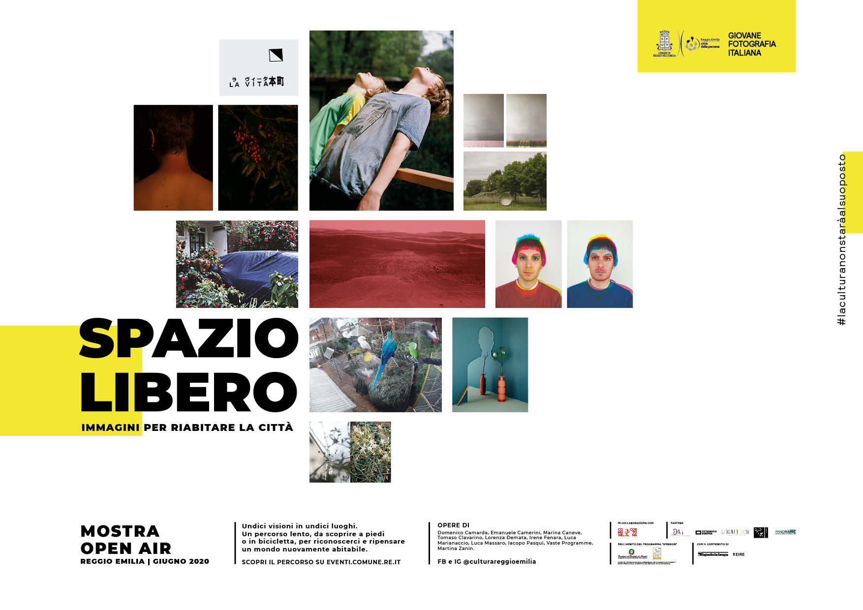 Gli impianti destinati all’affissione di manifesti pubblicitari, rimasti in silenzio per più di due mesi, si preparano ad ospitare le visioni di undici artisti italiani, tutti provenienti dall’esperienza di Giovane Fotografia Italiana, il progetto dedicato ai talenti under 35 nell’ambito del festival reggiano Fotografia Europea: Domenico Camarda, Emanuele Camerini, Marina Caneve, Tomaso Clavarino, Lorenza Demata, Irene Fenara, Luca Marianaccio, Luca Massaro, Iacopo Pasqui, il collettivo Vaste Programme e Martina Zanin.