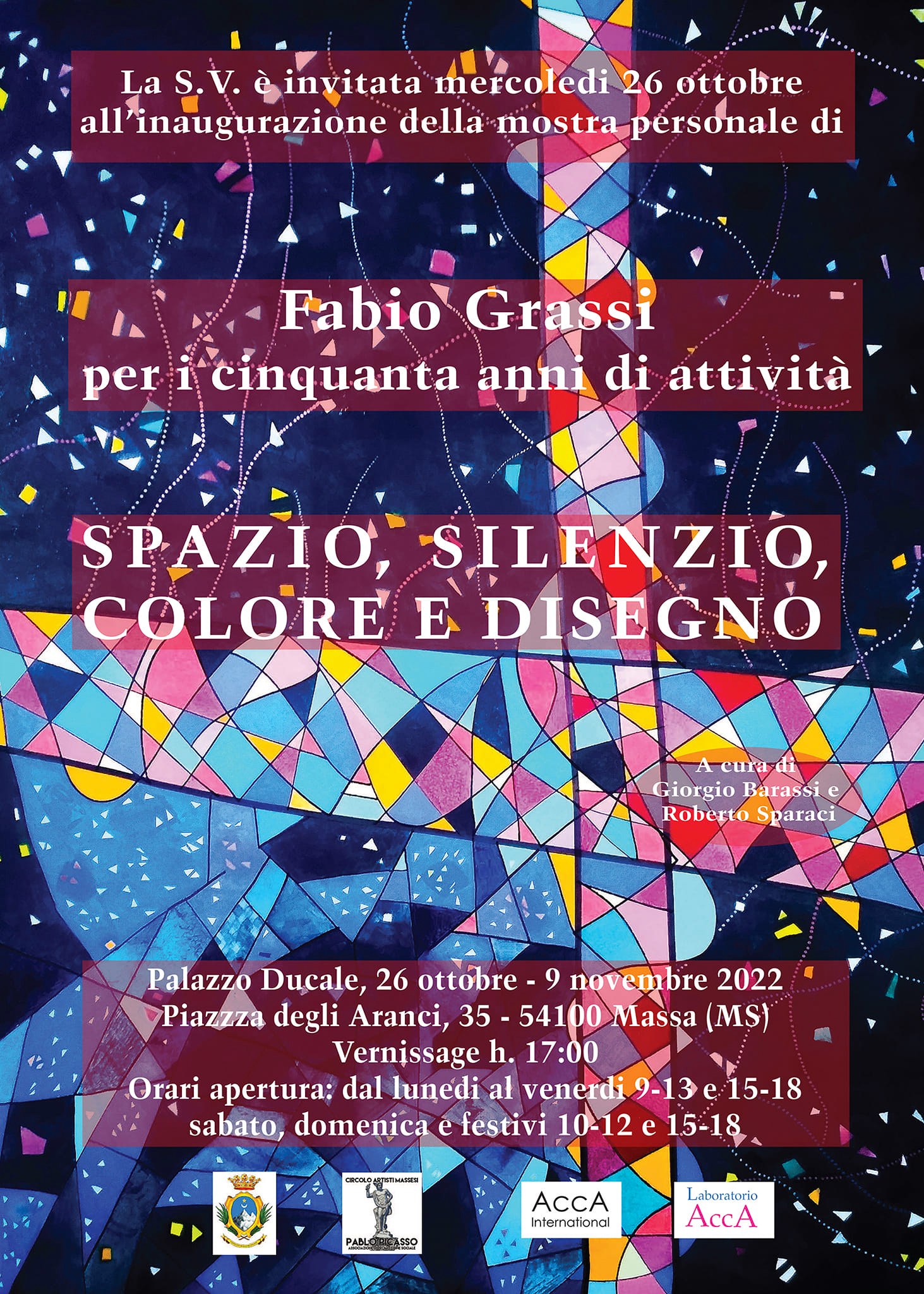 Cinquanta anni di pittura, disegno e ricerca in una mostra nel Salone degli Svizzeri al Palazzo Ducale di Massa. Fabio Grassi, pittore massese, espone le testimonianze del proprio percorso artistico per festeggiare un traguardo importante e confermare la sua capacità di artista preparato e solido nei propri principi compositivi. Dai paesaggi toscani che annunciavano già la ricerca sullo Spazio come contenitore e contenuto, ai disegni in formati notevolissimi, eseguiti solo a matita su carta, alle opere più recenti, notissime al pubblico di Laboratorio Acca, la trasmissione domenicale in onda sui canali di Arte Investimenti TV.