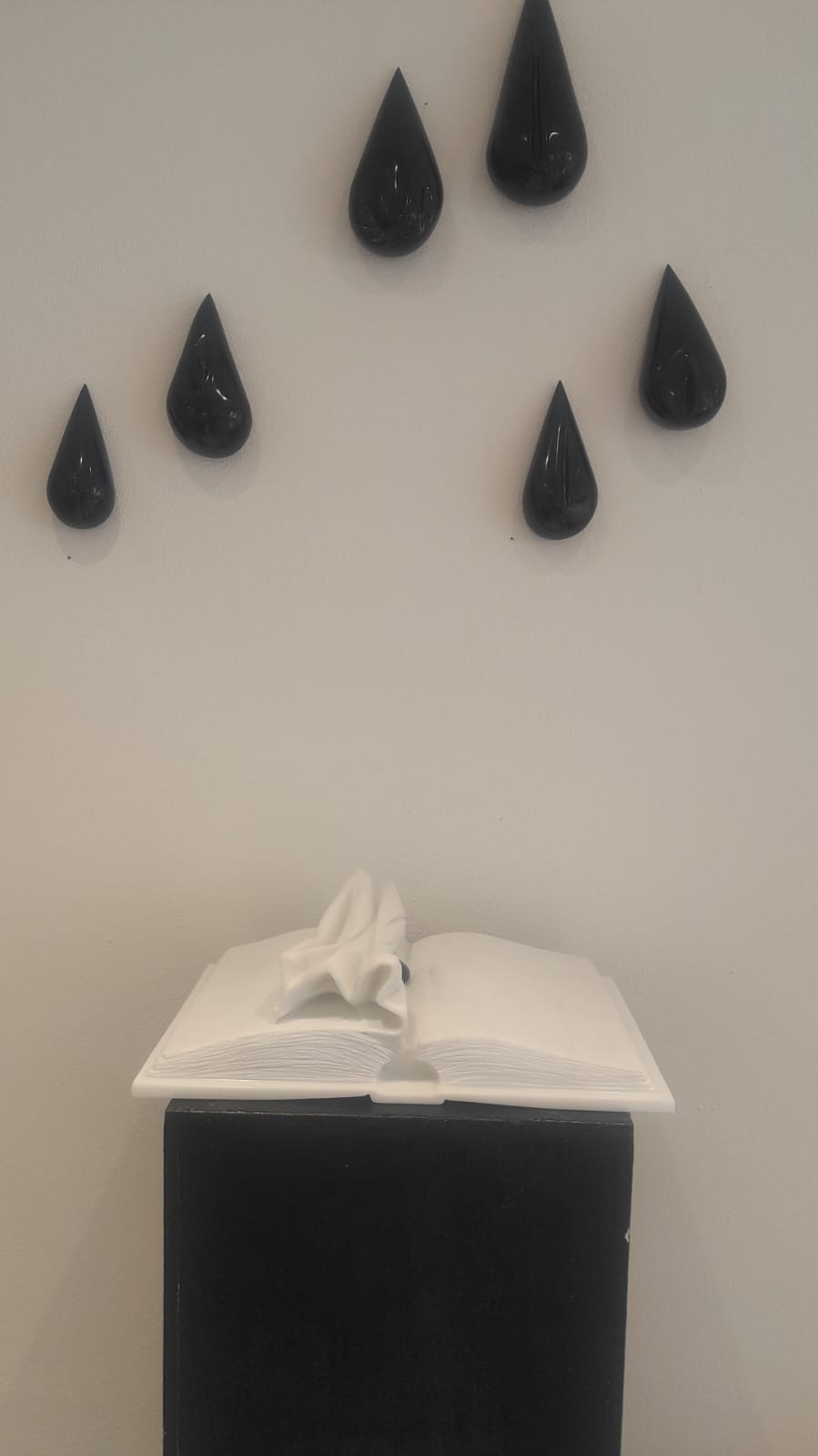 La scultrice Aidan Salakhova, nativa dell’Azerbaigian, ha scelto la Città di Carrara come base per il suo laboratorio creativo, alla ricerca del materiale fornito dalle Cave, presentando un libro realizzato in fine Marmo bianco di Carrara e un’installazione di gocce in marmo nero.