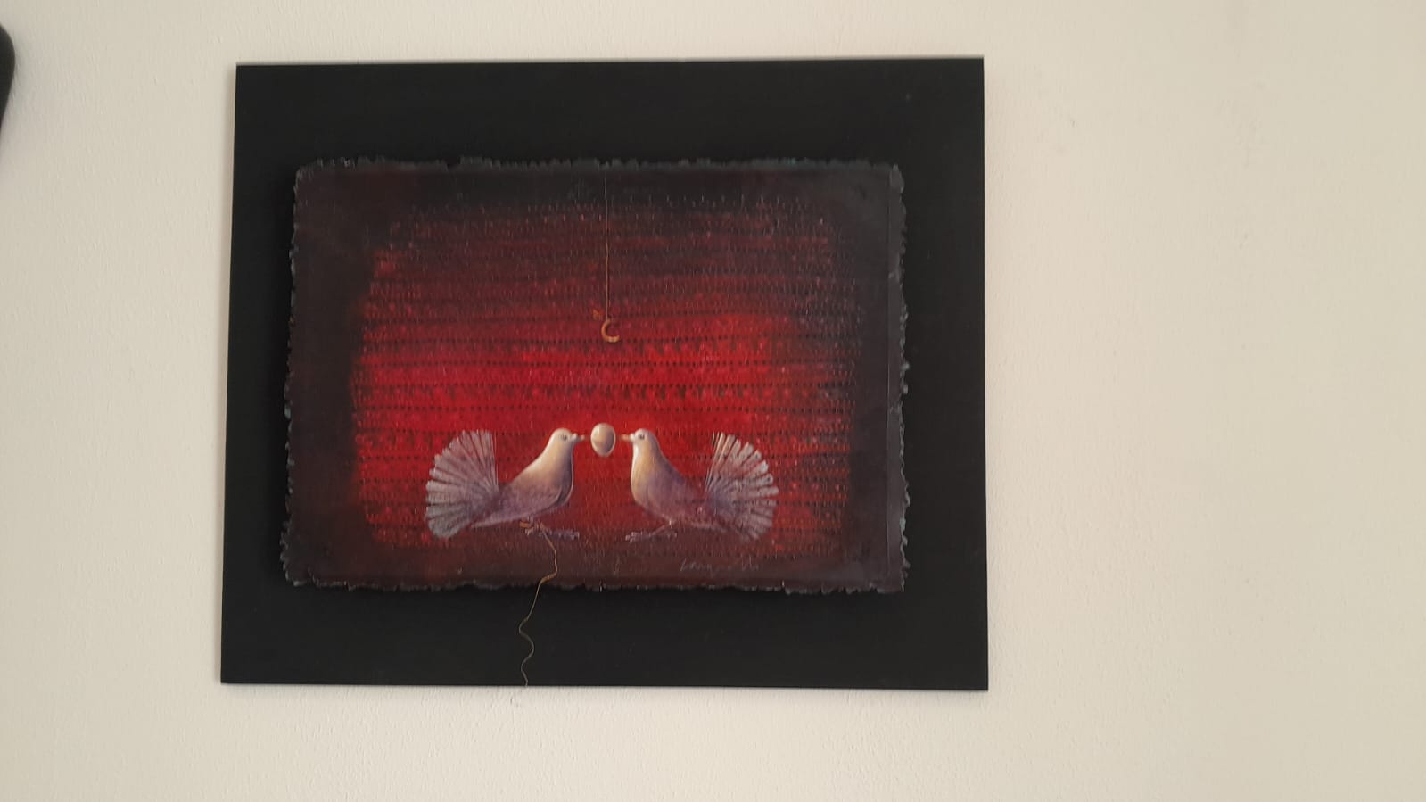 Claudio Cargiolli, importante pittore di Carrara, appartenente al genere del Realismo magico, espone un’opera figurativa, rappresentante due colombe su un ricco sfondo rosso, custodita in una teca, a sottolinearne la sua preziosità.