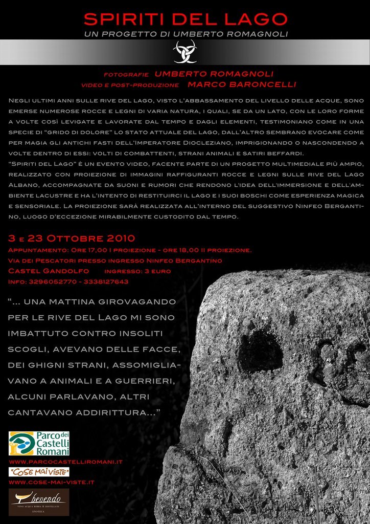 “Spiriti del Lago” è un evento video, facente parte di un progetto multimediale più ampio, realizzato con proiezione di immagini raffiguranti rocce e legni sulle rive del Lago Albano, accompagnate da suoni e rumori che rendono l'idea dell'immersione e dell'ambiente lacustre e ha l’intento di restituirci il lago e i suoi boschi come esperienza magica e sensoriale. La proiezione sarà realizzata all’interno del suggestivo Ninfeo Bergantino, luogo d’eccezione mirabilmente custodito dal tempo.
