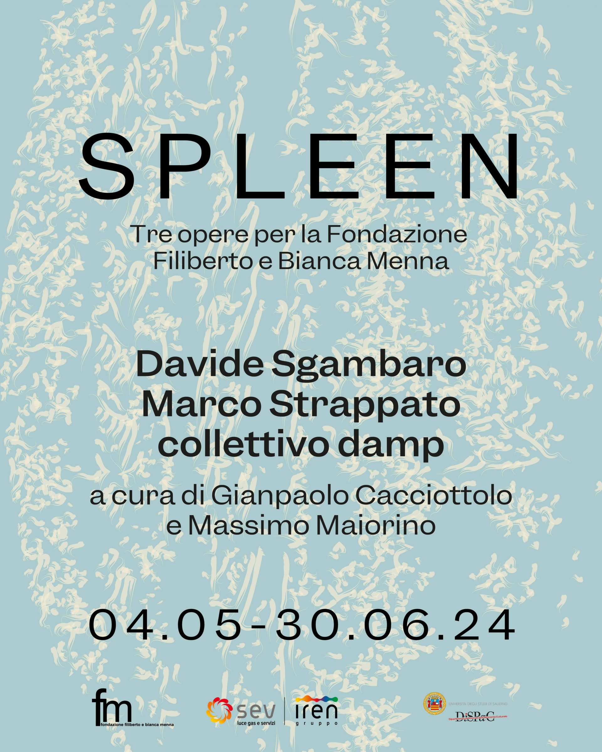 SPLEEN. Tre opere per la Fondazione Filiberto e Bianca Menna, a cura di Gianpaolo Cacciottolo e Massimo Maiorino (4 maggio – 30 giugno 2024), è un progetto realizzato con il sostegno di SEV Iren e con il patrocinio del DiSPaC - Dipartimento di Scienze del Patrimonio Culturale dell’Università degli Studi di Salerno.