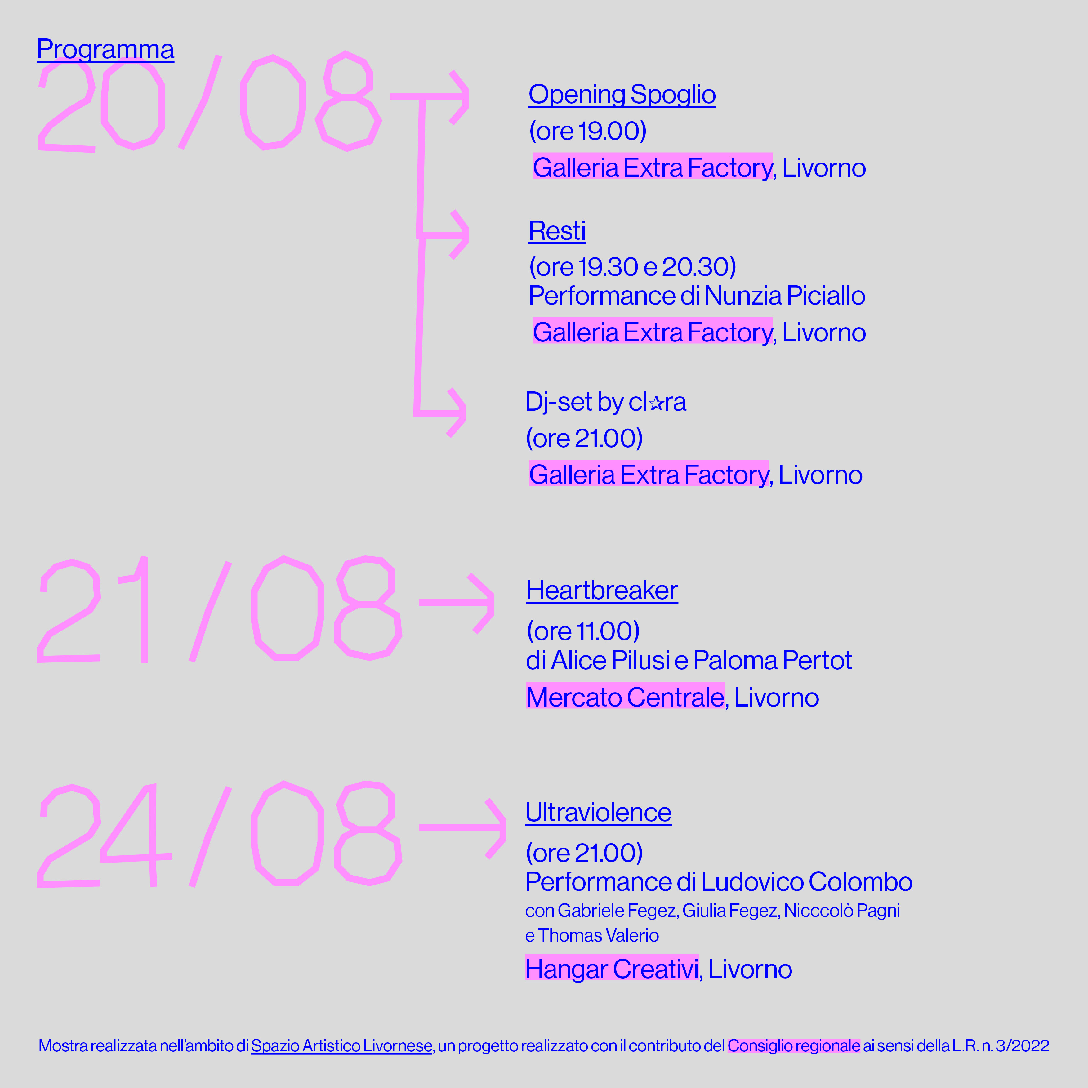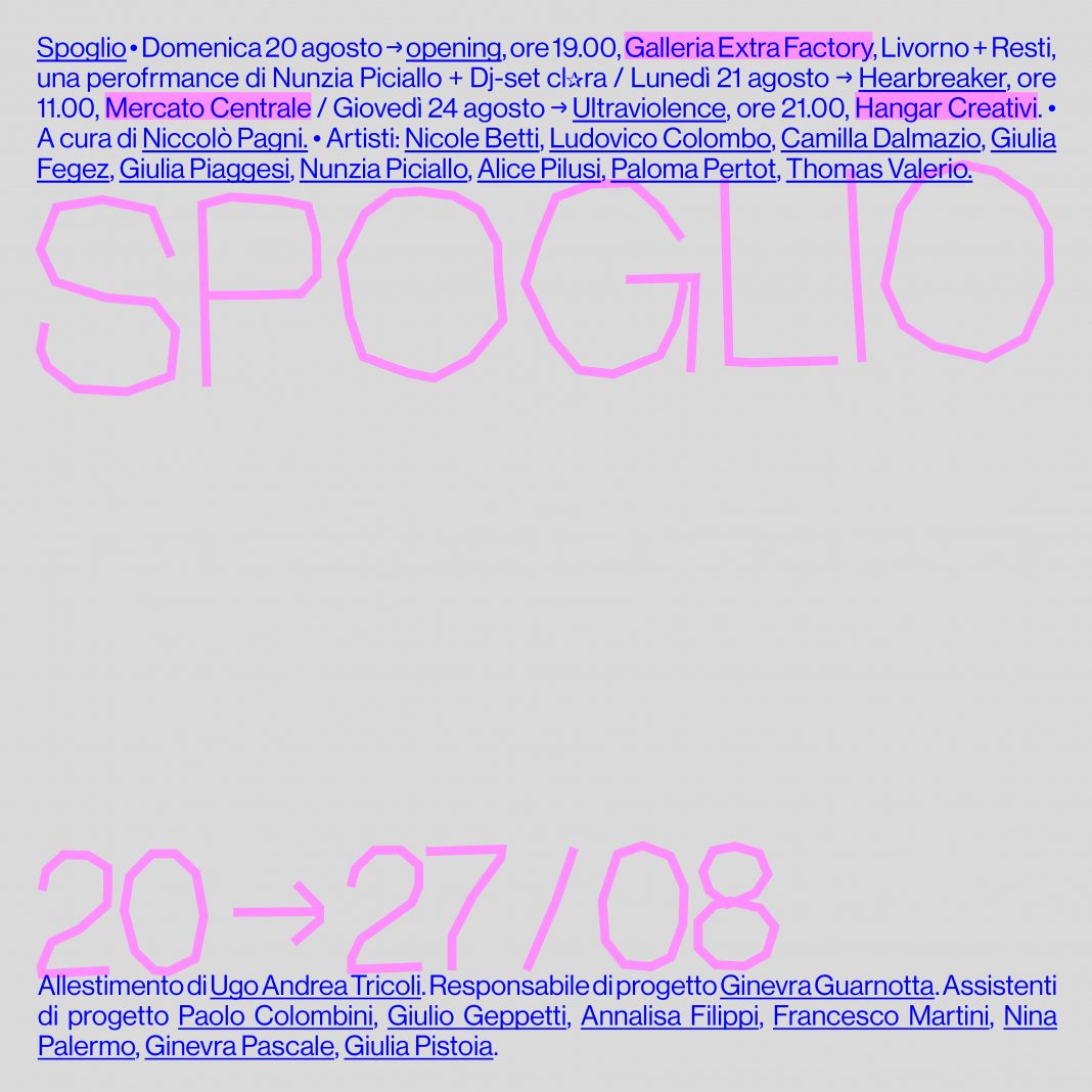 La mostra collettiva propone una riflessione sul tema dello “SPOGLIO”. Una rassegna artistica che, attraverso le opere di Nicole Betti, Ludovico Colombo, Camilla Dalmazio, Giulia Fegez, Paloma Pertot, Giulia Piaggesi, Nunzia Piciallo, Alice Pilusi e Thomas Valerio, indaga le molteplici declinazioni del tema che dà il titolo all'evento.