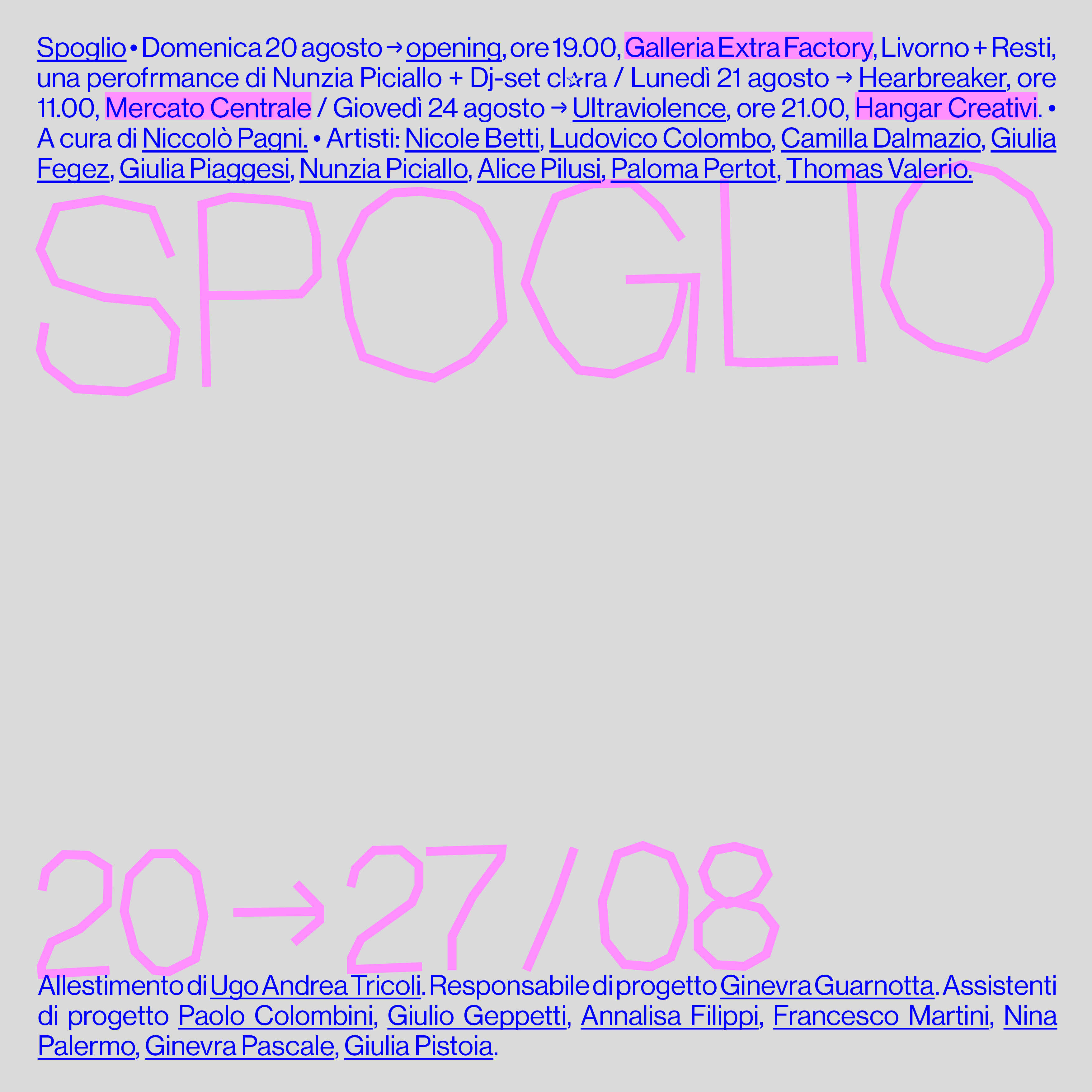 Una mostra collettiva che propone una riflessione sul tema dello “SPOGLIO” e che attraverso le opere di Nicole Betti, Ludovico Colombo, Camilla Dalmazio, Giulia Fegez, Paloma Pertot, Giulia Piaggesi, Nunzia Piciallo, Alice Pilusi e Thomas Valerio, indaga le molteplici declinazioni del tema.