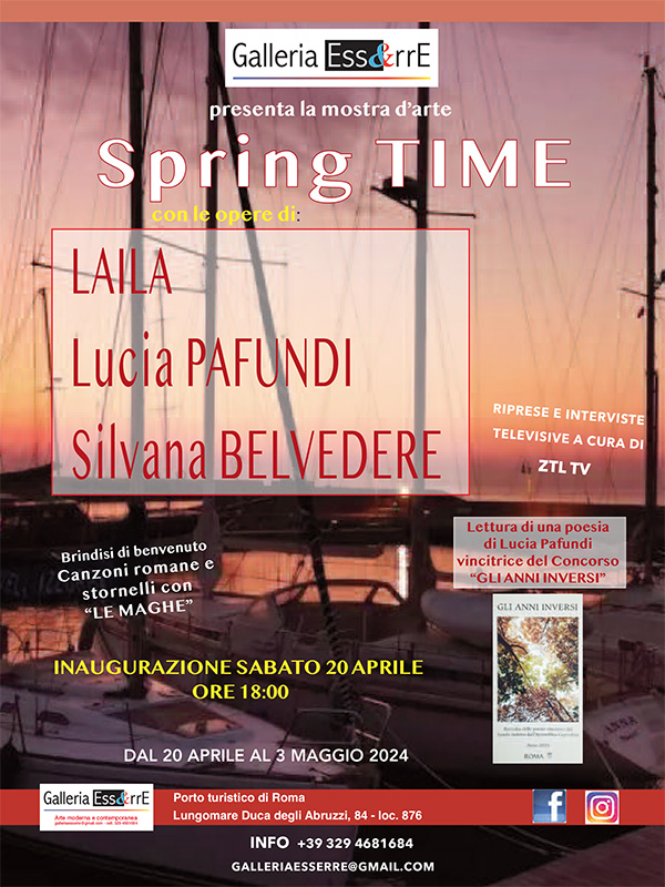 La Galleria Ess&rrE ospita nella sede del Porto turistico di Roma una delle più interessanti mostre della programmazione artistica del 2024 che apre i battenti il 20 aprile alle ore 18:00 con circa 30 opere realizzate per l’occasione da LAILA, LUCIA PAFUNDI e SILVANA BELVEDERE. L’eleganza e la bellezza oltre che la particolare ed interessante stesura dei colori sulle tele opportunamente dipinte dai nostri tre validi autori, fanno di questa mostra una delle più interessanti, in termini di particolarità, esposizioni organizzate dalla Galleria Ess&rrE. La scelta è quella di accogliere gli artisti e le loro creazioni nei propri spazi, con l’obiettivo di offrire a un pubblico più possibile variegato e numeroso con occasioni diverse di approfondimento culturale nella splendida passeggiata del Porto turistico di Roma. E la mostra “Spring TIME”, avrà gli autori presenti per l’inaugurazione pronti a soddisfare ogni curiosità per i più attenti alle qualità pittoriche delle opere in mostra. L’organizzazione si impegna a continuare questa tradizione di eventi scelti e organizzati sempre nell’ottica dell’aggregazione e dell’integrazione con il territorio laziale che ricordiamo essere a due passi dalla Tor San Michele, realizzata su progetto di Michelangelo Buonarroti, e dagli Scavi di Ostia Antica, secondi per estensione solo a Pompei. La selezione sulle scelte opportunatamente fatte da Alessandra Antonelli, curatrice della mostra, vi introdurrà nella realtà estetica assoluta e presentiamo questa nuova bellissima iniziativa, proponendo, inoltre, la lettura di una poesia di Lucia Pafundi, vincitrice del concorso “GLI ANNI INVERSI”. La particolare dedizione delle scelte artistiche sono altresì mirate per far incontrare lo sguardo agli utenti più giovani nella loro vita quotidiana, aprendo così una finestra verso l’altrove e il piacere estetico. La mostra allestita con particolare cura sarà vissuta al Porto di Roma con un nuovo appassionato entusiasmo e un brindisi inaugurale con le canzoni romane e gli stornelli delle “MAGHE” che suoneranno, canteranno e danzeranno creando una magica atmosfera per momenti indimenticabili con le canzoni romane e gli stornelli che sono la base del loro vasto repertorio.