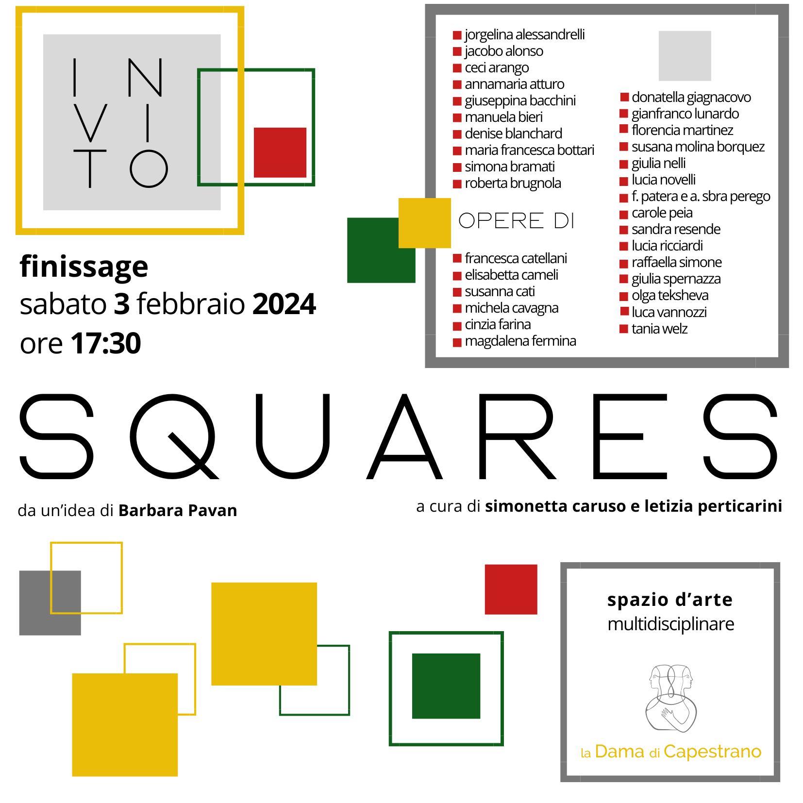 Curata da Simonetta Caruso e Letizia Perticarini, da un’idea di Barbara Pavan - SQUARES include le opere di Jorgelina Alessandrelli, Jacobo Alonso, Ceci Arango, Annamaria Atturo, Giuseppina Bacchini, Manuela Bieri, Denise Blanchard, Maria Francesca Bottari, Simona Bramati, Roberta Brugnola, Elisabetta Cameli, Francesca Catellani, Susanna Cati, Michela Cavagna, Cinzia Farina, Magdalena Fermina, Donatella Giagnacovo, Gianfranco Lunardo, Florencia Martinez, Susana Molina Borquez, Giulia Nelli, Lucia Novelli, Federica Patera e Andrea Sbra Perego, Carole Peia, Sandra Resende, Lucia Ricciardi, Raffaella Simone, Giulia Spernazza, Olga Teksheva, Luca Vannozzi, Tania Welz.