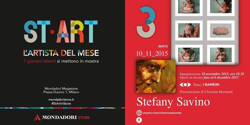 Si inaugura Martedí il 10 Novembre presso Mondadori Megastore, Piazza Duomo 1, Milano, h 18:00 la personale di Stefany Savino, terza personale del progetto St-Art L'Artista del Mese, un progetto culturale destinato a valorizzare i giovani artisti contemporanei, evento promosso da Mondadori Retail e organizzato da ArtRelation di Milo Goj.