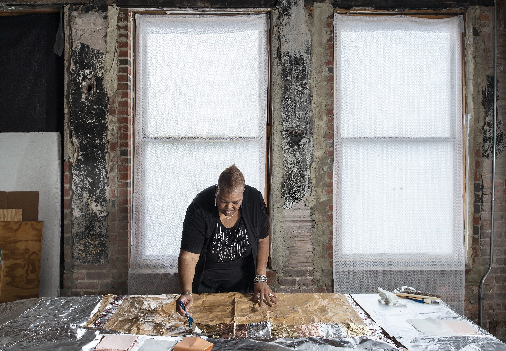 "Oltre ai paesaggi, ai ritratti e ad altri approcci rappresentativi, ho creato una serie in corso intitolata "Coperte d'emergenza danneggiate". Carta espansiva e danneggiata e materiale cartaceo, questi pezzi sono contemporaneamente campi astratti e bidimensionali e materiale scultoreo flessibile che può essere modellato in una varietà di forme con vari livelli di rilievo. Ogni pezzo diventa un'ode a un iconoclasta o ad un evento come Thelma "Butterfly" McQueen, Octavia Butler o il Black and Blue Atlantic. L'idea originale di questi pezzi è nata dal fascino dei quadrati di Mylar, apparentemente inerti, utilizzati per fornire fonti di calore d'emergenza a corridori, escursionisti all'aperto, vittime di circostanze, ecc. Negli ultimi anni, queste coperte riflettenti sono diventate un simbolo per le persone che compiono lo straziante viaggio di migrazione da varie parti del mondo in cerca di rifugio e per i bambini latino-americani nei campi di internamento che sono stati forzatamente separati dalle loro famiglie durante la disfatta dell'immigrazione che è diventata un simbolo globale di cattiva condotta e di paura nazionalista". (Waddell, 2022)