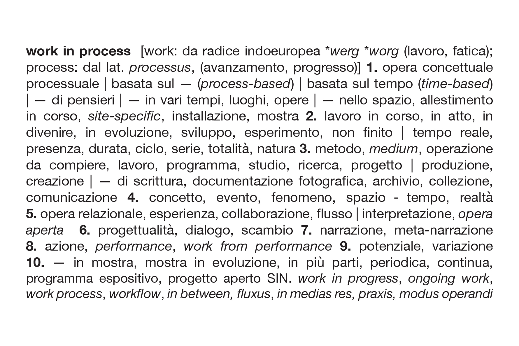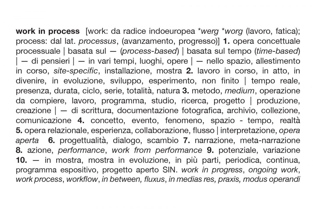 Il ciclo “Work in Process”, inteso sia come 'lavoro in corso' che come 'opera concettuale processuale', documenta l’attività ed il focus della galleria, dando il titolo alla pubblicazione che ne traccia l’evoluzione.