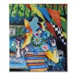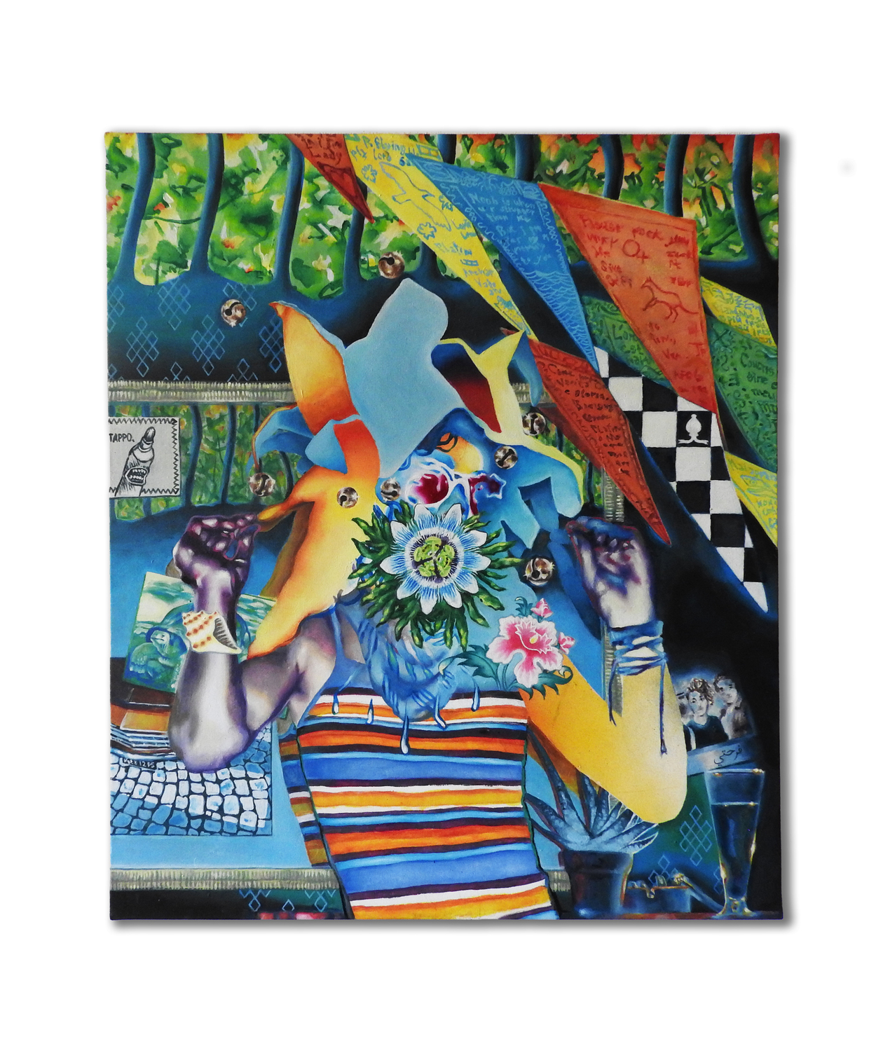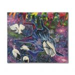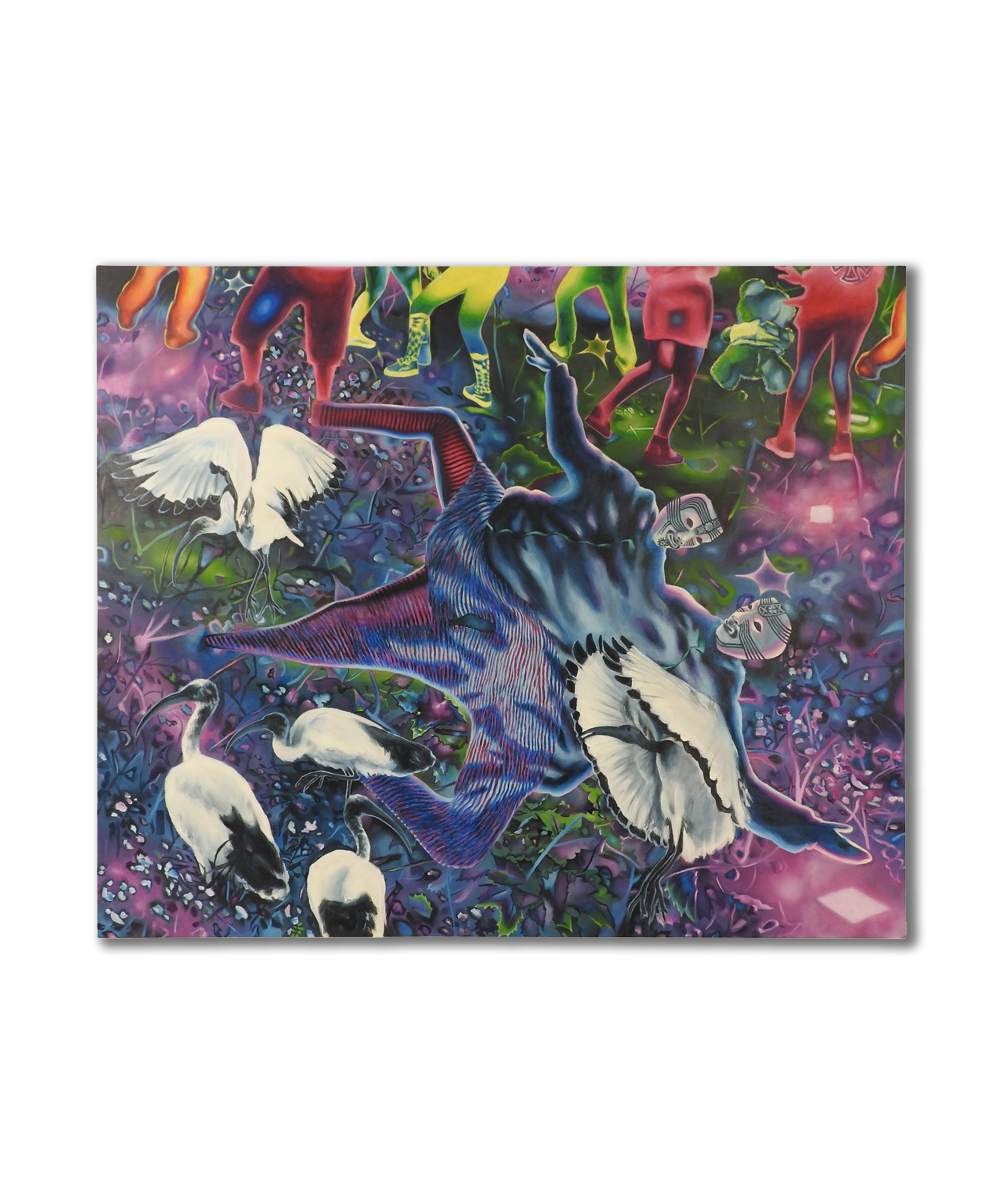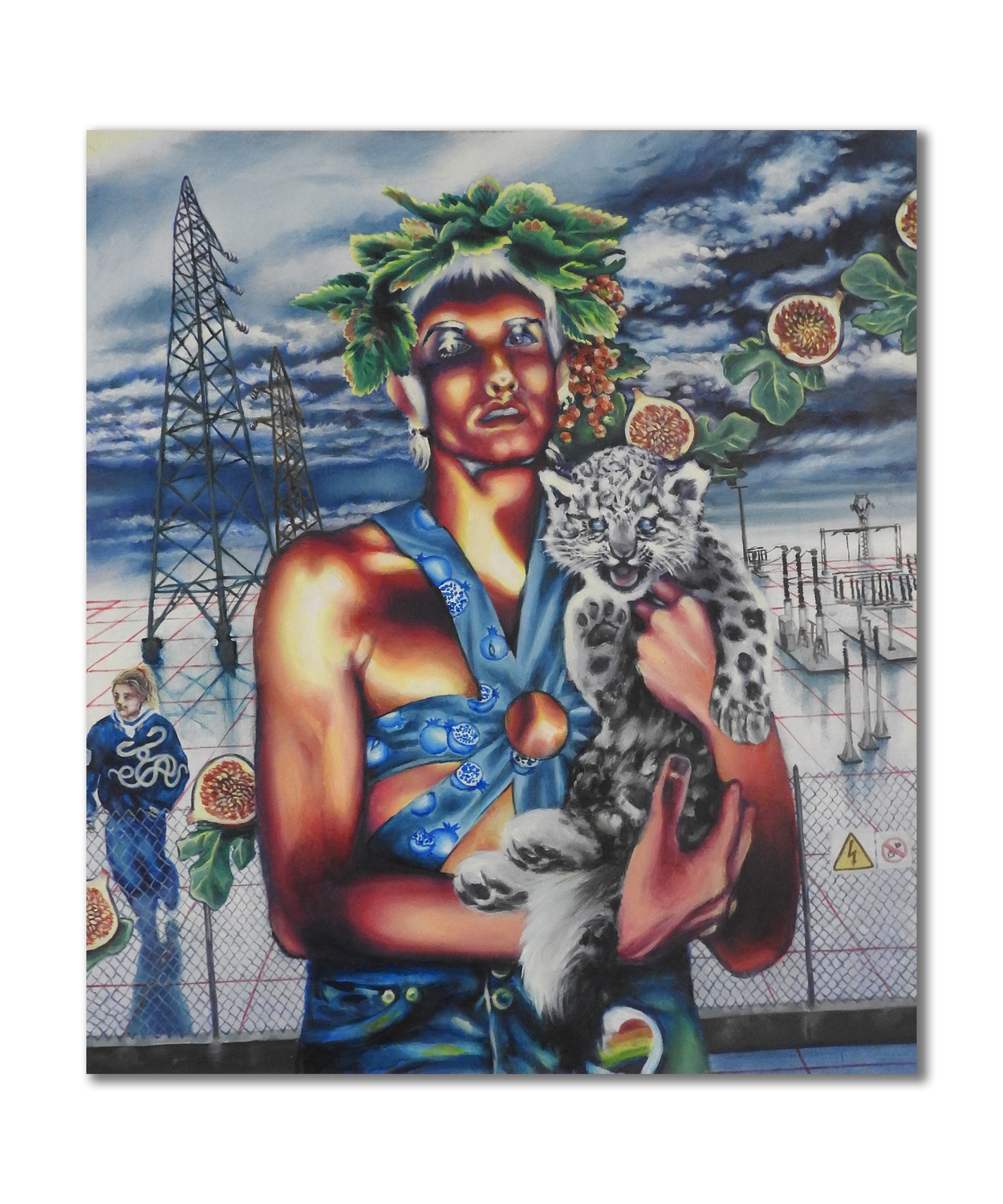 Nelle opere di Giacomo Incannella i dettagli colpiscono l’attenzione: campanelli, fiori, conchiglie, foto di persone sconosciute, elementi che connotano le opere di un alone onirico, dove ciascuno può trovare qualcosa nel quale ricordarsi, il correlativo oggettivo di Eliot prende forma su tela. Un’altra immagine frequente nelle opere dell’artista sono gli animali. Il ghepardo è un animale forte, determinato, feroce e nei sogni può avere molti significati: autodeterminazione, repressione di passione e desiderio nella vita reale. Nel teatro perverso dei sogni la realizzazione simbolica degli accadimenti e delle figure fonde livelli diversi del reale: un Dioniso contemporaneo tiene in mano un cucciolo di ghepardo, simbolo della divinità, mentre una ragazza cammina in una centrale elettrica, senza uscita. L’istinto feroce e l’eccessività di Dioniso si contrappongono al romanticismo della ragazza in solitaria. Nel flusso artistico Giacomo Incannella crea piani difformi, ognuno abitato da creature differenti. L’ibis è un animale che nell’immaginario onirico rappresenta la capacità di esplorare il proprio subconscio, la surrealtà in cui sono inseriti è psichedelica, assurda, due danzanti si muovono in un mare di colori surreali. L’artista rende l’immagine esteticamente e simbolicamente sublime, l’utilizzo del colore accentua il carattere surreale della scena.