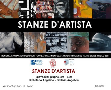 Si inaugura giovedì 21 giugno alle ore 18.30 nei prestigiosi spazi espositivi della Biblioteca Angelica, la mostra Stanze d'artista: Benetta, Cannavacciuolo, Coni, De Cuarto Floreani, Giannoni, Guaitamacchi, Paladino, Parisi, Sidibè, Troilo, Zefi.
