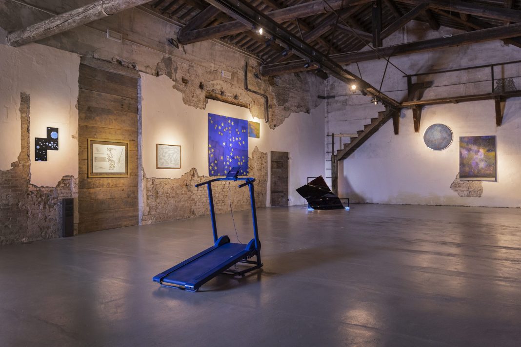 Stargazers I apre la riflessione nella sede di Padova, con una selezione di lavori che affrontano le tematiche da punti di vista differenti: Serena Gamba, Natale Addamiano, Matteo Nasini ci trasportano all’interno di superfici siderali, mentre John Torreano, Silvia Mariotti, Serena Vestrucci, Antonello Ghezzi si pongono in dialogo con la materia e ne traslano il ruolo e il significato, alla ricerca delle suggestioni che trapelano dall’universo. Visioni che si incontrano con le famose superfici lunari di Giulio Turcato e del poliedrico Tony Dallara. Al centro dello spazio espositivo è collocata l’opera del duo Antonello Ghezzi dal titolo Alla Luna, un tapis roulant il cui display mo-