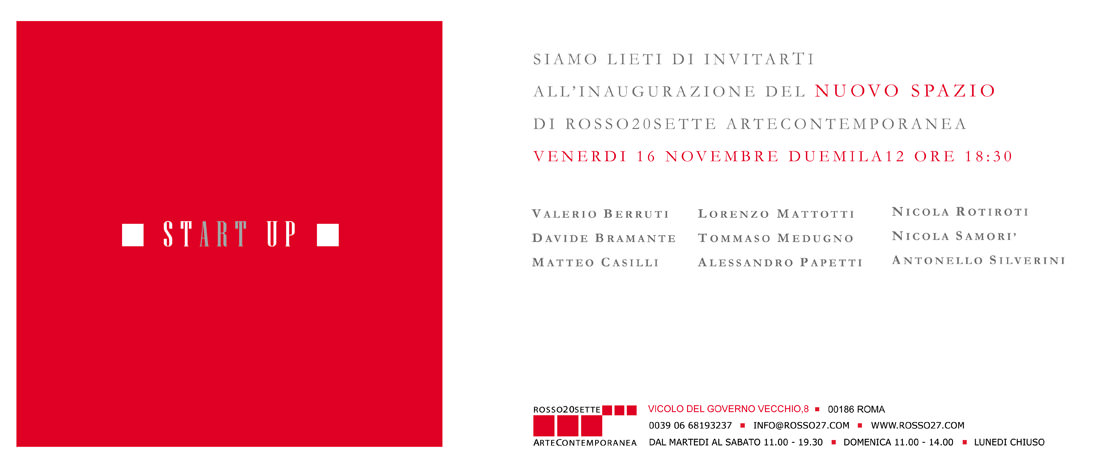Rosso20sette Arte Contemporanea inaugura con la collettiva Start Up un nuovo spazio in vicolo del Governo Vecchio 8,in pieno centro storico a pochi passsi da Piazza Navona.