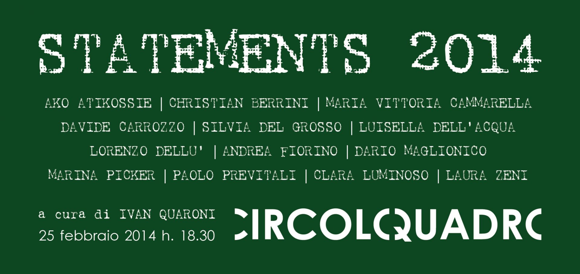 Statements 2014 si configura come una collettiva “condivisa”. I tredici artisti in mostra hanno infatti lavorato insieme per due mesi mettendo in comune pensieri, critiche , idee e condividendo le criticità che emergevano durante gli incontri. Un gruppo coeso è infine arrivato al traguardo stabilito: una piena consapevolezza della propria produzione artistica.