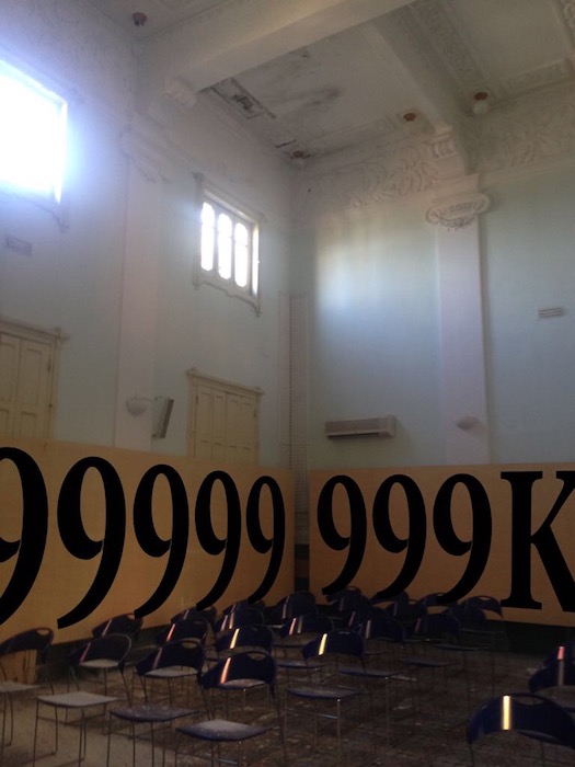 Accanto ad una relazione diretta con lo spazio espositivo e a una doratura che mira, appunto, a evidenziare l’importanza di uno spazio e di una figura della critica tra le più brillanti del secondo Novecento, un arioso lavori su tavola (si tratta di una scritta a muro formata da una serie di 9 con K finale) offre una ulteriore visione spaziale, dove sono le lettere, questa volta, a toccare lo sguardo dello spettatore per invitarlo ad un dialogo, ad una riflessione.
