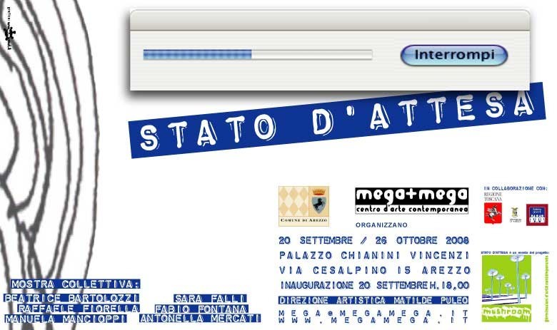 Per Beatrice Bartolozzi, Sara Falli, Raffaele Fiorella, Fabio Fontana, Manuela Mancioppi e Antonella Mercati, trovarsi in uno STATO D’ATTESA, significa essere giunti ad una fermata e imbattersi in una sosta. Aspettare fiduciosi ma al tempo stesso prepararsi alla partenza e annunciare al mondo quanto sia prossima la metamorfosi.