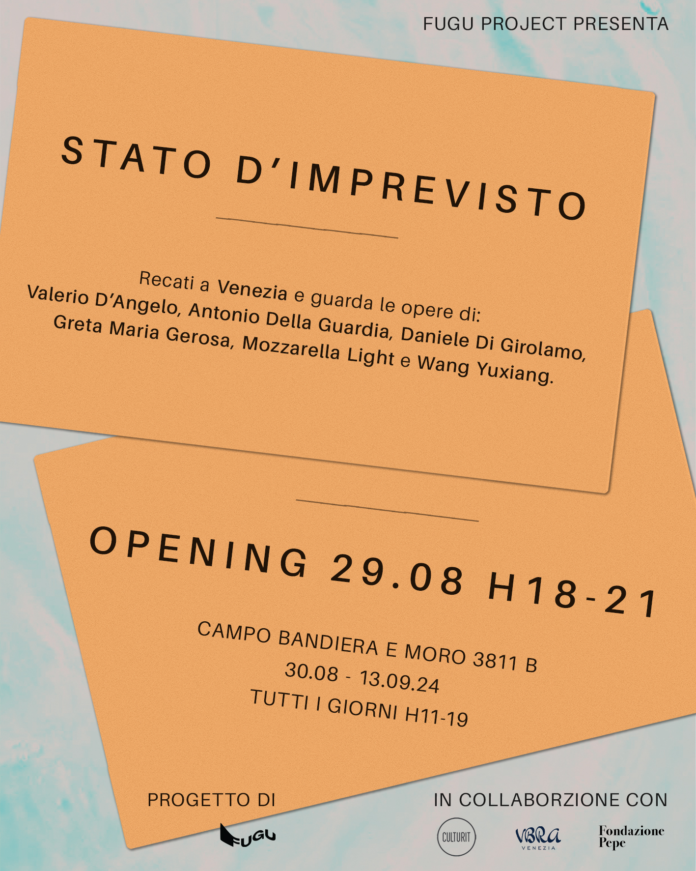 Giovedì 29 agosto 2024 inaugura alle ore 18:00 la mostra STATO D’IMPREVISTO con le opere di Valerio D’Angelo, Antonio Della Guardia, Daniele Di Girolamo, Greta Maria Gerosa, Mozzarella Light e Wang Yuxiang.