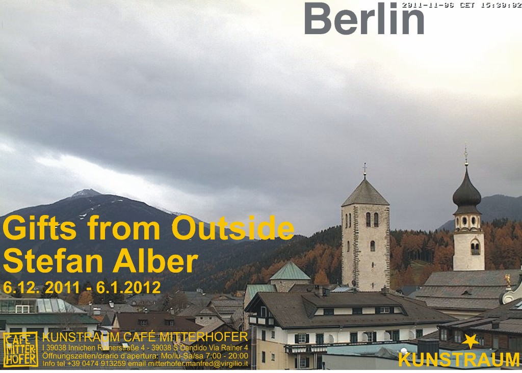 La VETRINA D’ARTE 2011 nel Kunstraum Café Mitterhofer dal 6 dicembre al 6 gennaio presenta l’artista Stefan Alber con il videoprogetto “Gifts from Outside. Il progetto “VETRINA D‘ARTE” offre ad artisti uno spazio per un confronto critico/artistico con il periodo natalizio.