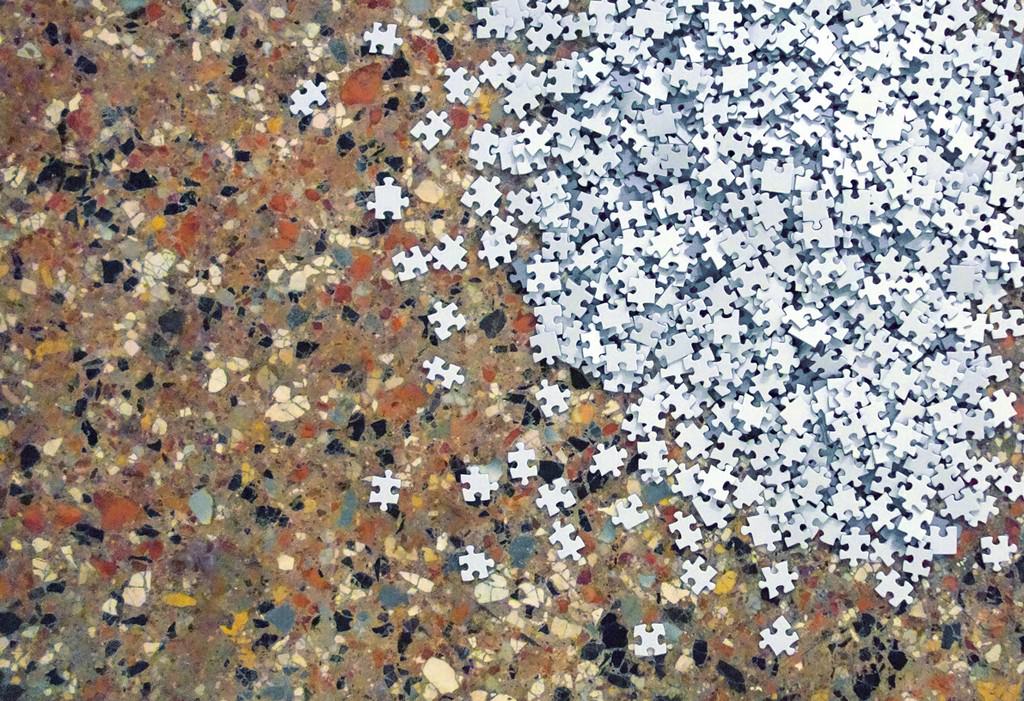 Fersini’s site specific installation could be considered as a tautological gesture for the inherent desire to reveal on the puzzle what the eye can see during the composition of the puzzle itself. It involves the viewer’s interaction and in order to build the puzzle, she does not provide the resulting image, but the reality itself that is represented in the work. The "player" will find a fragmented reality broken in his hands. It’s a mise an abyme that needs to be defined and confirmed.