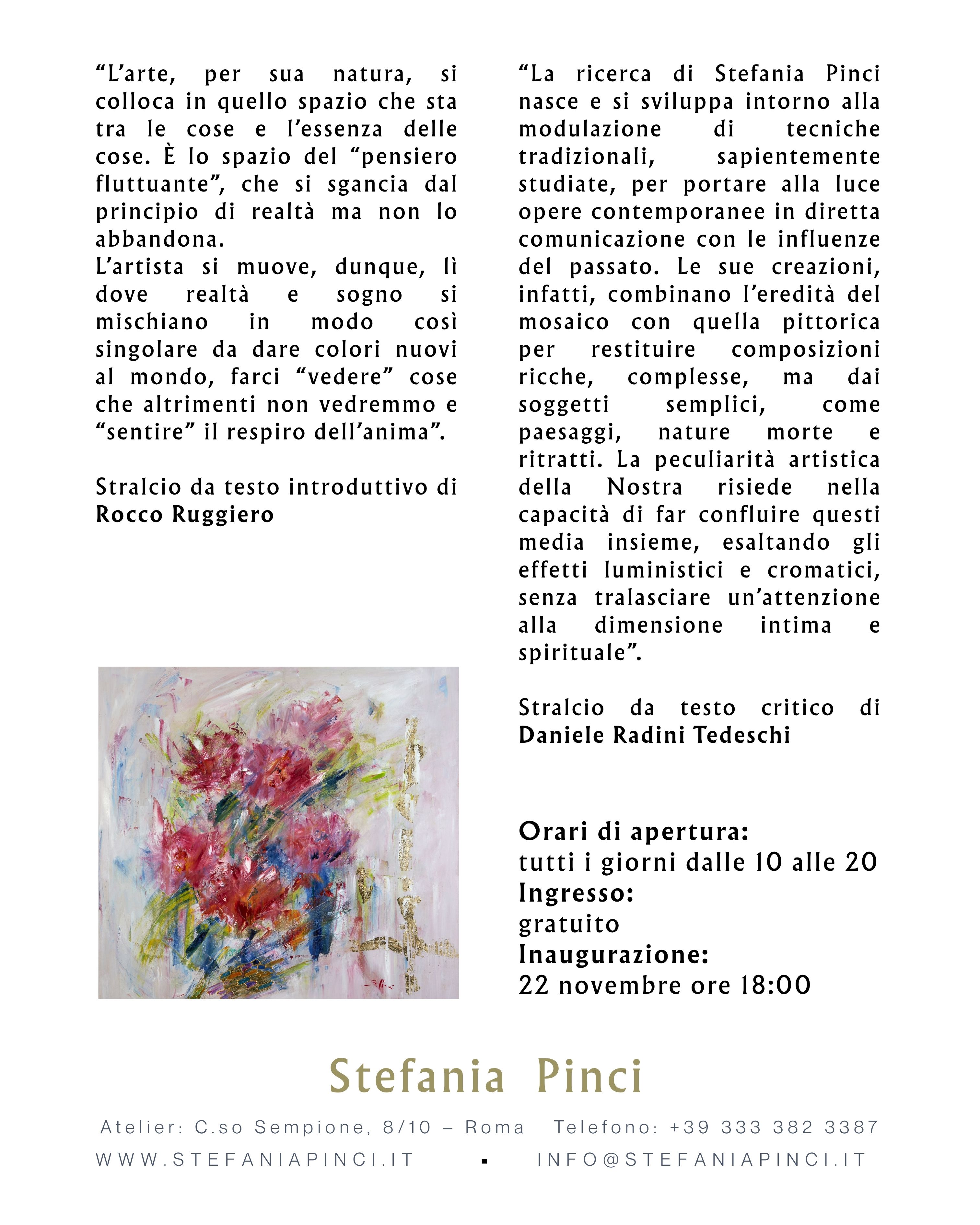 La ricerca di Stefania Pinci nasce e si sviluppa intorno alla modulazione di tecniche tradizionali, sapientemente studiate, per portare alla luce opere contemporanee in diretta comunicazione con le influenze del passato. Le sue creazioni, infatti, combinano l’eredità del mosaico con quella pittorica per restituire composizioni ricche, complesse, ma dai soggetti semplici, come paesaggi, nature morte e ritratti. La peculiarità artistica dell’Artista risiede nella capacità di far confluire questi media insieme, esaltando gli effetti luministici e cromatici, senza tralasciare un’attenzione alla dimensione intima e spirituale.