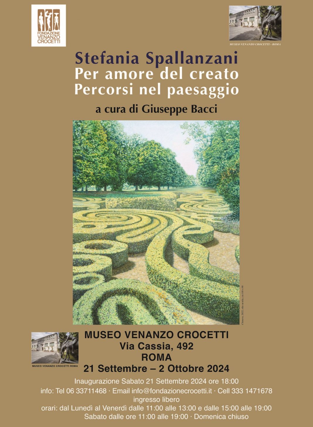 Il 21 settembre 2024 alle ore 18:00, al Museo Venanzo Crocetti di Roma, si inaugura la mostra Stefania SPALLANZANI Per amore del Creato. Percorsi nel paesaggio, a cura di Giuseppe BACCI, che riunisce una trentacinquina di opere della pittrice emiliana Stefania Spallanzani