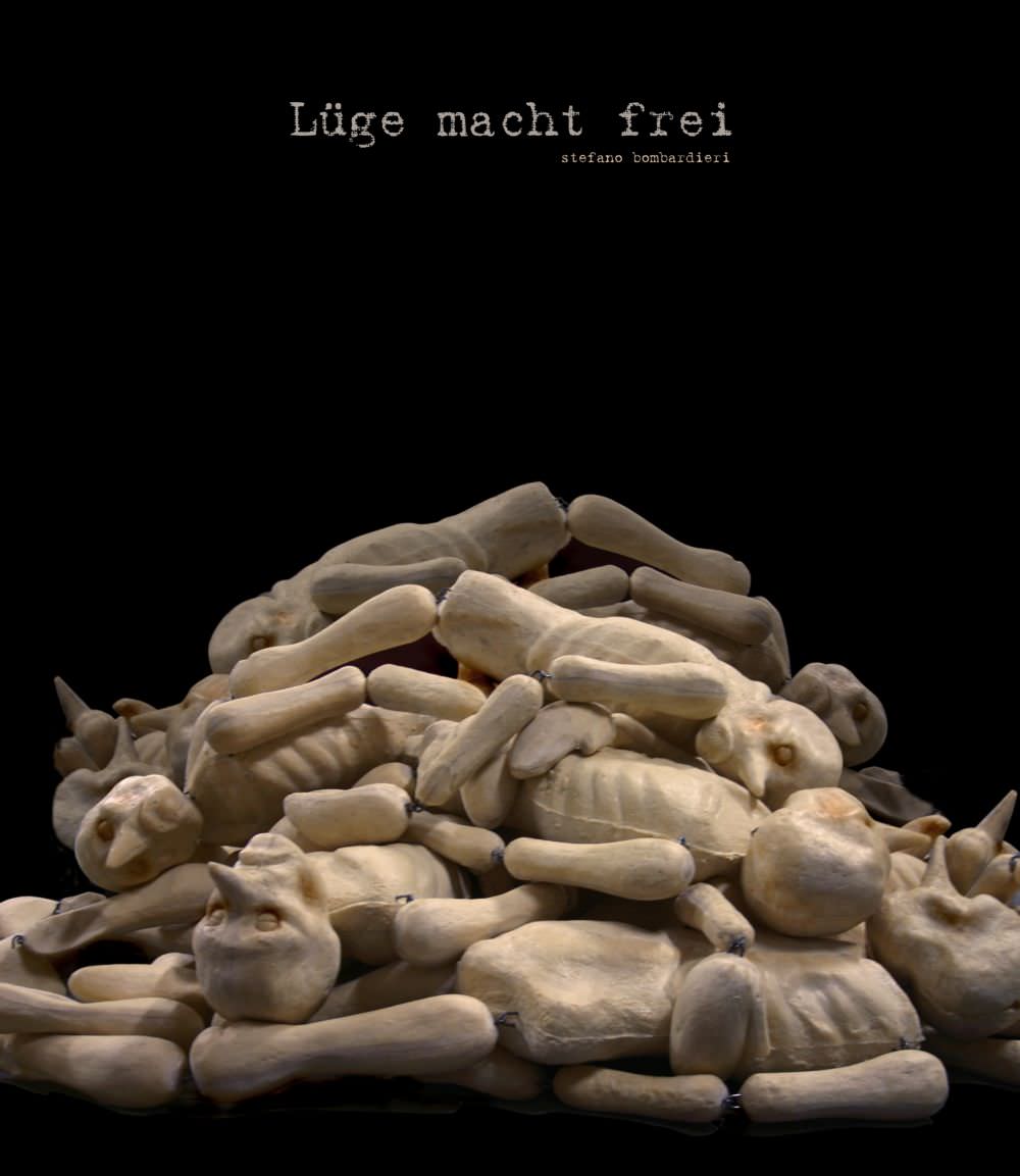 I battenti dell’esposizione si aprono con la scritta Lüge macht frei, con chiaro riferimento alla scritta posta sugli ingressi di numerosi campi di concentramento (Arbeit macht frei), e l’Artista conduce lo spettatore in uno spazio surreale, quanto concreto, nella storia e nella finzione, nella tragedia e nella favola, in un’insolita visione, un pastiche, che sovrappone i contesti e mescola le percezioni sensoriali.