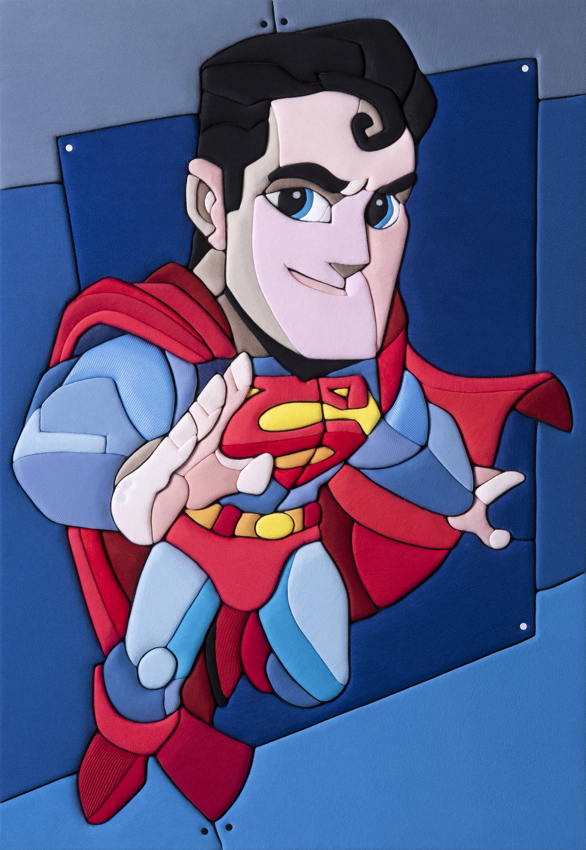 Stefano Bressani propone il ciclo di opere Hyper Heroes, dove i supereroi dell’infanzia assumono occhi grandi e sguardi al tempo stesso dolci o ammiccanti, secondo la tradizione chibi dei manga giapponesi, attraverso una congiuntura di tessuti che rendono la bidimensionalità in tridimensionalità.