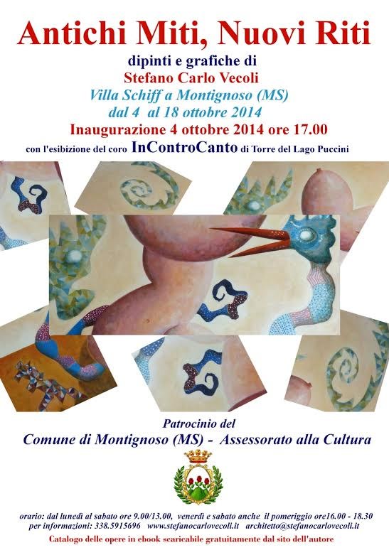 Si apre Sabato 4 Ottobre prossimo, alle ore 17.00, a Villa Schiff a Montignoso, con il Patrocinio del Comune e dell'Assessorato alla Cultura, una nuova mostra dell'architetto S.C. Vecoli, dal titolo suggestivo: "Antichi Miti, Nuovi Riti". E' una rivisitazione in chiave moderna, a volte ironica e beffarda a volte allegra e spensierata, degli antichi miti della mitologia greca e romana, con incursioni anche della tradizione cristiana, che invita lo spettatore a godere, oltre che dei colori e delle composizioni pittoriche, anche a riflettere sui nuovi miti odierni e su come a volte si riaffacciano sotto altre forme.