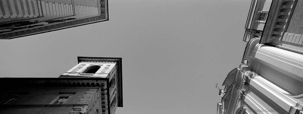 L'esposizione è il risultato di una ricerca estetica iniziata nel 2005 con l'intenzione di mettere in evidenza la relazione talvolta armoniosa talvolta contrastante, tra l'architettura antica e moderna di Roma. L'uso sistematico dell'inquadratura verso l'alto dal livello del terreno sostituisce il punto di vista del passante. La scelta del bianco e nero genera immagini di pura eleganza visiva che risultano perfettamente bilanciate con i marmi della collezione di scultura antica esposta nel Museo di Palazzo Altemps. Rivolgendo lo sguardo verso l'alto attraverso le fotografie, il pubblico potrà scorgere un'inedita e talora inattesa immagine della città.