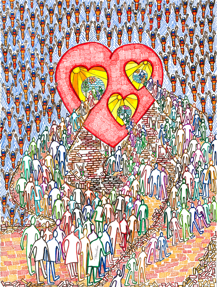Pensieri, frammenti di vita, riflessioni sospese tra il silenzio e l’inquietudine della quotidianità, sono raccolti in linee e colori vivaci che costruiscono un diario quotidiano di rispecchiamento: traduzione in immagini delle prima pagine, la complessa e dolorosa storia contemporanea a livello globale, ma anche le piccole gioie nazionali come le vicissitudini calcistiche, tanto amate dagli italiani, o le Olimpiadi ma anche l’opening alla Biennale di Venezia. Scritti e parole si insinuano nel testo visivo come a ricalcare il vocabolario della condivisione collettiva dei grandi avvenimenti: parole sensazionalistiche, emotive, grandiose che traducono la fibrillazione della notizia appena uscita, così come le chiacchiere da bar alla lettura dei quotidiani.