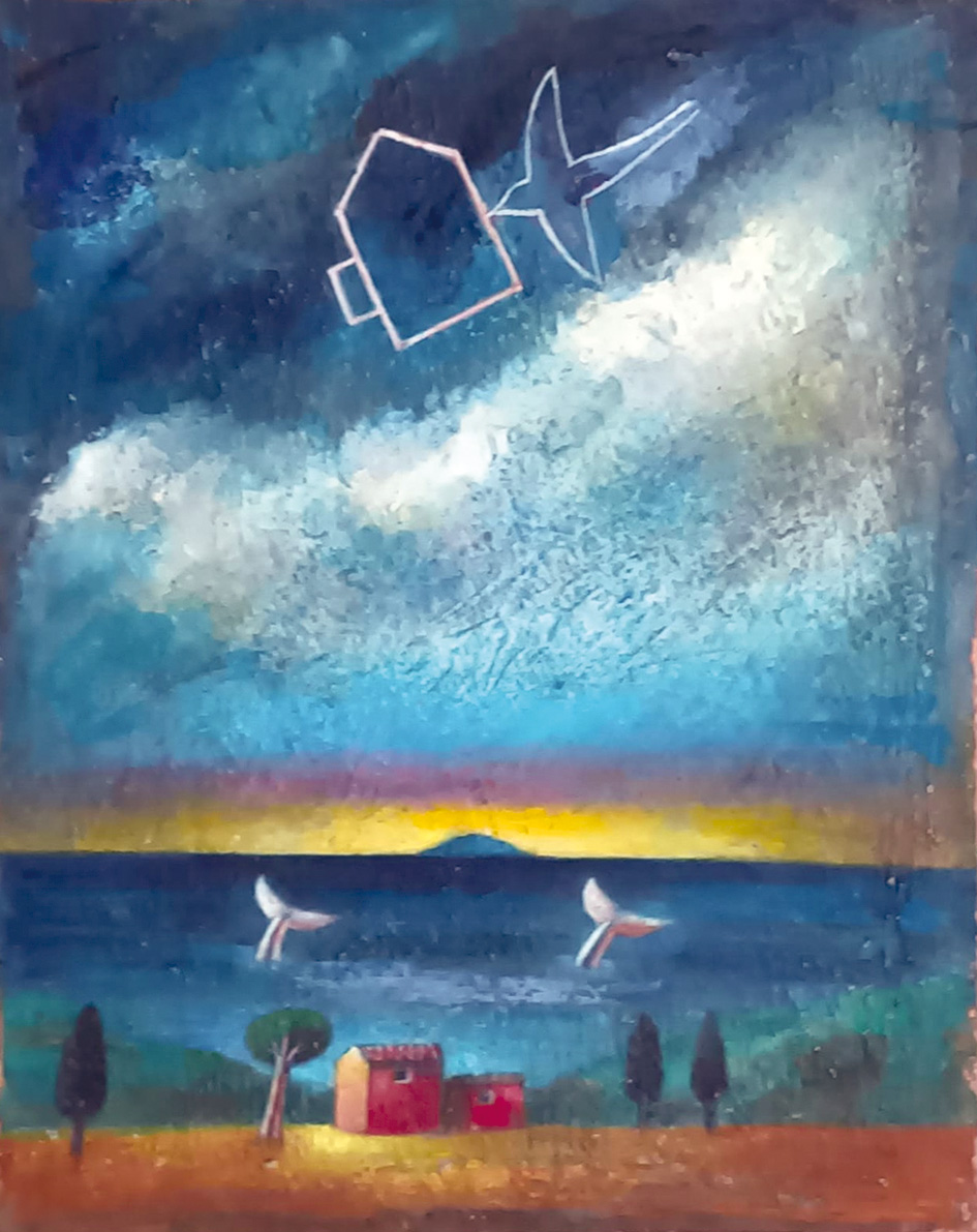 I suoi ultimi dipinti dalle tonalità azzurre presentano oggetti fantastici, volanti, in squarci di paesaggio nel quale spesso emerge l’isola di Gorgona, l’isola della sua infanzia, ebbe a scrivere l’artista: “Sono nato sulle colline livornesi, la valle che vedevo ogni giorno affacciata sul mare custodiva all’orizzonte l’isola di Gorgona con la inconfondibile sagoma da vecchia balena addormentata, con un paesaggio di tale bellezza non potevo che diventare pittore…”.