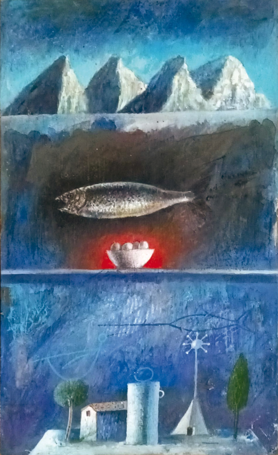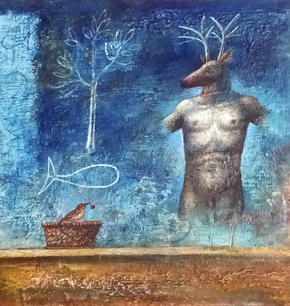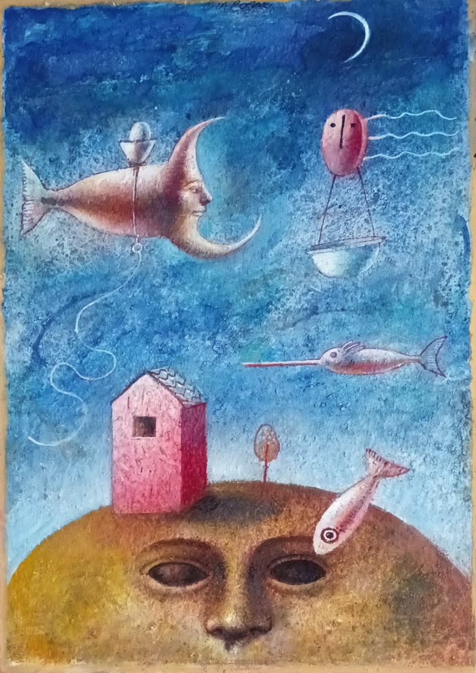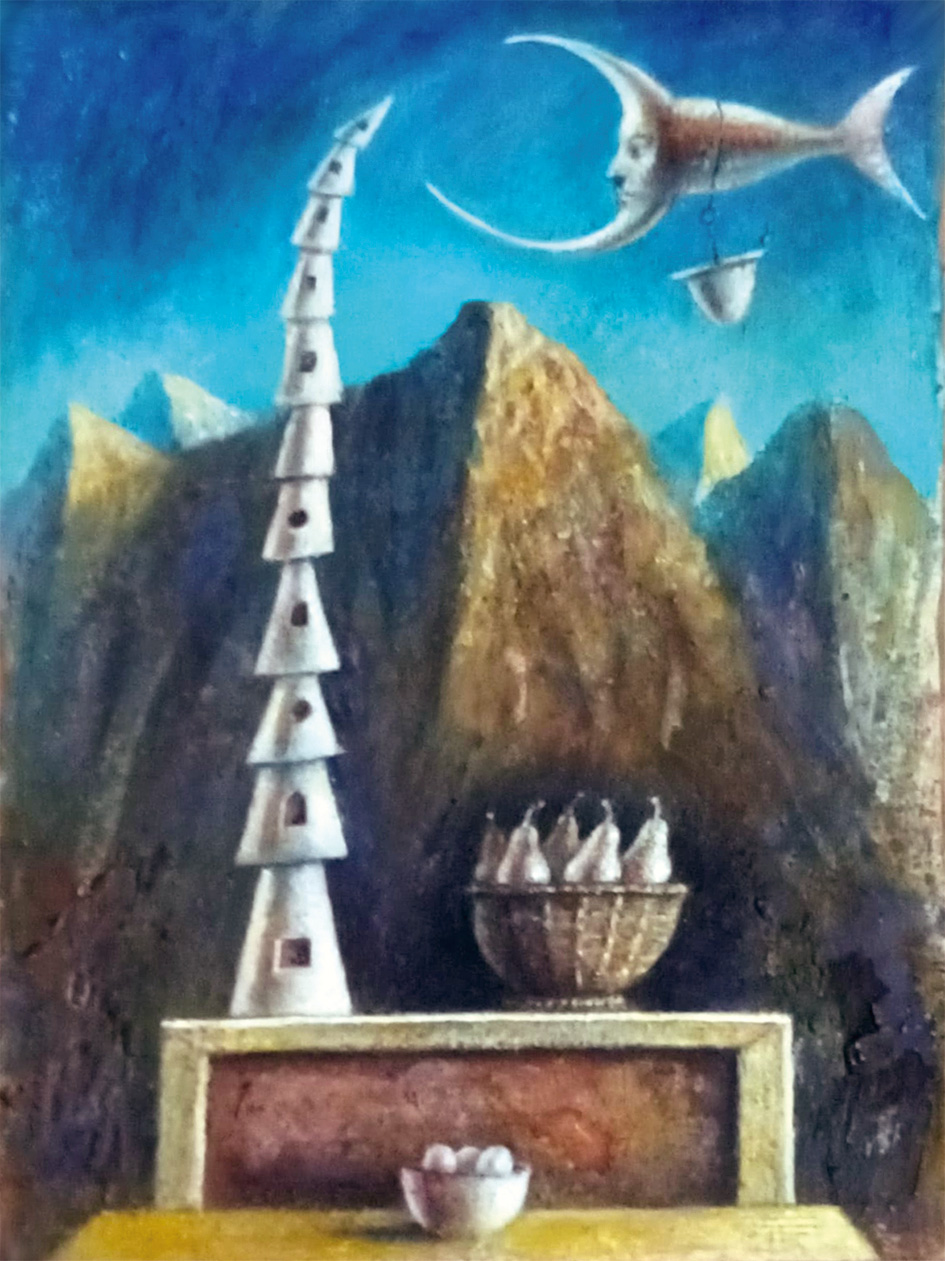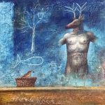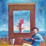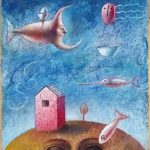 Come pittore lo ho conosciuto più tardi, onirico, fedele ancora ad una pittura “dipinta” le cui superfici ricche di un vissuto pittorico di grande qualità si accompagnano alla straripante inventiva dei suoi lavori.