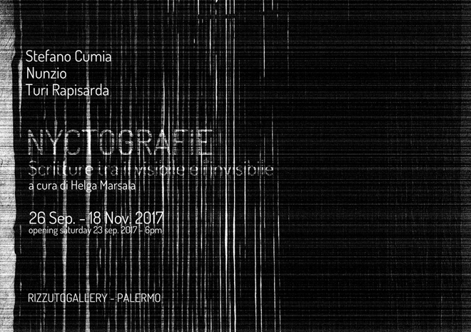 RizzutoGallery (via Maletto 5, Palermo) è lieta di presentare “Nyctografie. Scritture tra il visibile e l’invisibile”, una mostra a tre voci che vede a fianco Stefano Cumia, Nunzio e Turi Rapisarda, a cura di Helga Marsala, che sarà inaugurata sabato 23 settembre 2017 alle ore 18, e resterà visitabile fino al 18 novembre, dal martedì al sabato, dalle 16.00 alle 20.00.