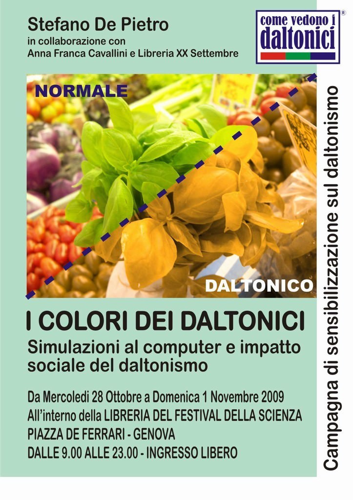 All’interno della Libreria del Festival della Scienza di Genova è stata montata la mostra “Come Vedono i Daltonici”, un’iniziativa personale di Stefano De Pietro, che ha realizzato un percorso sul daltonismo e su come i daltonici vedono i colori. L’arte, il semaforo, l’editoria, la natura sono alcuni dei temi toccati e per i quali attraverso la simulazione al computer si cerca di sensibilizzare le persone all’esistenza molto diffusa di questo tipo di differenza nella visione dei colori.