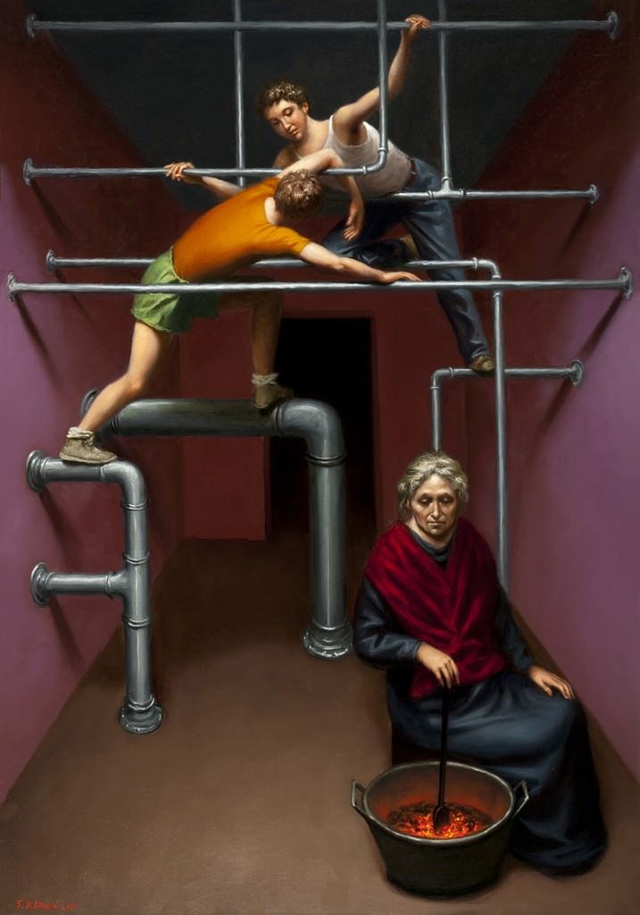mento, il Pizzo Cupone che ne modella i seni, allungandosi fino al Taburno che plasma i piedi. L’immagine che la suggestione analogica suggerisce alla nostra fantasia è maggiormente rimarcata dalla narrazione tessuta dall’artista che, non solo si serve della sagoma disegnata dal profilo dei monti, da secoli consolidata nei racconti che la tradizione tramanda, ma aggiunge ad essa ulteriori soggetti e figure propri della mitologia popolare beneventana. Fa leva sul senso di riconoscibilità dell’immagine, per agevolare il fruitore ad entrare nello spazio allestito dalla pittura, dal suo enigma; si serve del paesaggio per definire (perimetrare) il campo nel quale la sua azione si compie, perché, sia pensabile, che l’arte, la dimensione della sua relazione con la collettività, concorra al rinnovamento di un territorio e della sua comunità.