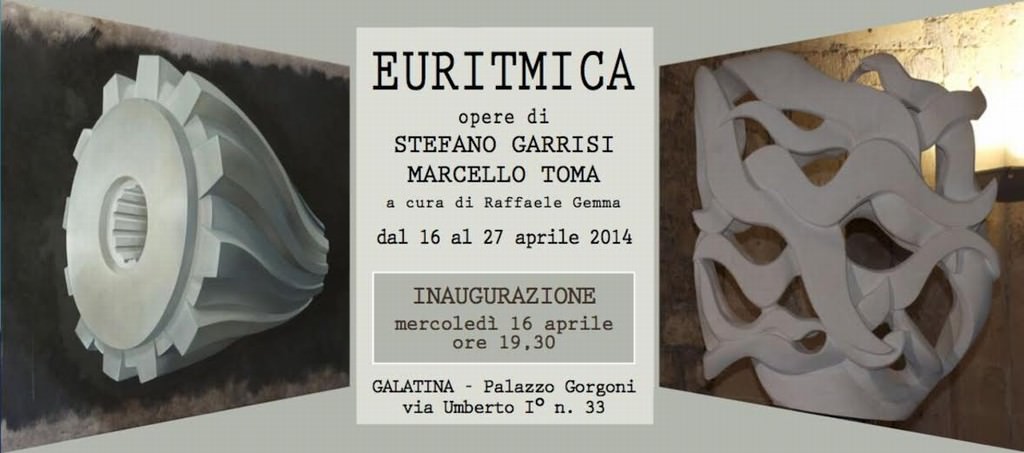 Euritmica, a cura di Raffaele Gemma, è la mostra personale di Stefano Garrisi, che presenta a palazzo Micheli-Gorgoni di Galatina (Le) un’antologia di sculture in pietra leccese realizzate a partire dal 2005, e Marcello Toma, che propone invece i suoi “Rotomatismi”, delle opere pittoriche realizzate più o meno nello stesso periodo.