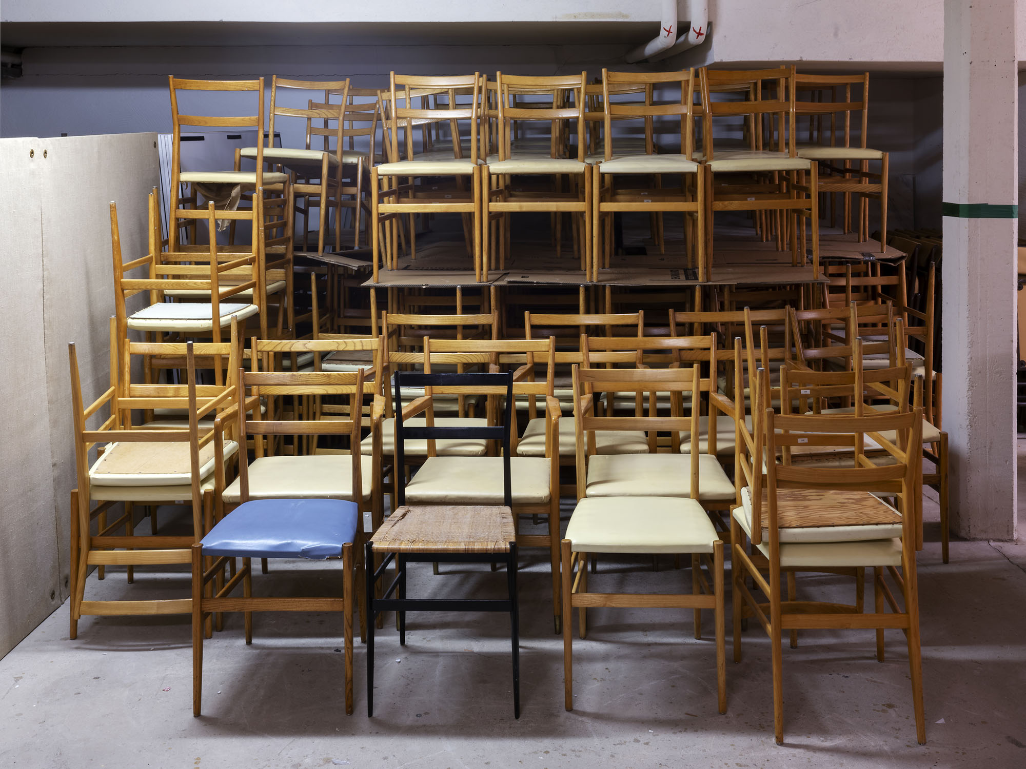 Nella chiesa del Suffragio, vediamo le immagini dei libri della collezione privata di Gordon Matta-Clark, conservati al Canadian Centre for Architecture di Montreal, che dialogano con il collegio universitario progettato da Giancarlo De Carlo per l’Università di Urbino. Oppure, la fotografia di un gruppo di Sedie Leggere e Superleggere di Gio Ponti, in un magazzino dell’Istituto Italiano di Cultura di Stoccolma, è accostata a una natura morta con pappagalli e frutta, in uno studio di architettura a Mumbai. E ancora, fuochi d’artificio e nature morte con funghi sono collegate a reperti del Museo Chileno de Arte Precolombino disegnato da Smiljan Radić a Santiago del Cile. Le fotografie di Graziani non solo rivelano luoghi, archivi e raccolte museali a cui solitamente il pubblico non ha accesso, ma li riattivano secondo logiche e prospettive del tutto soggettive.