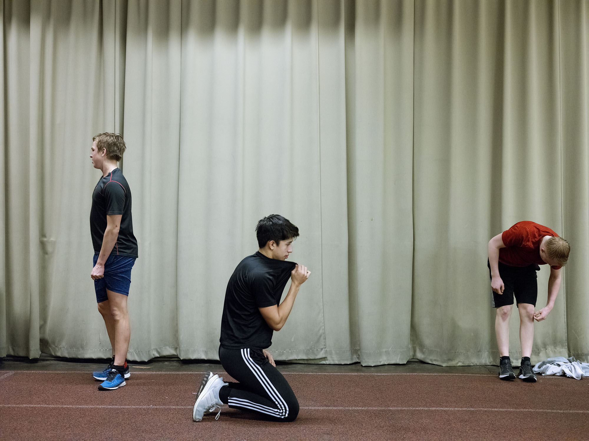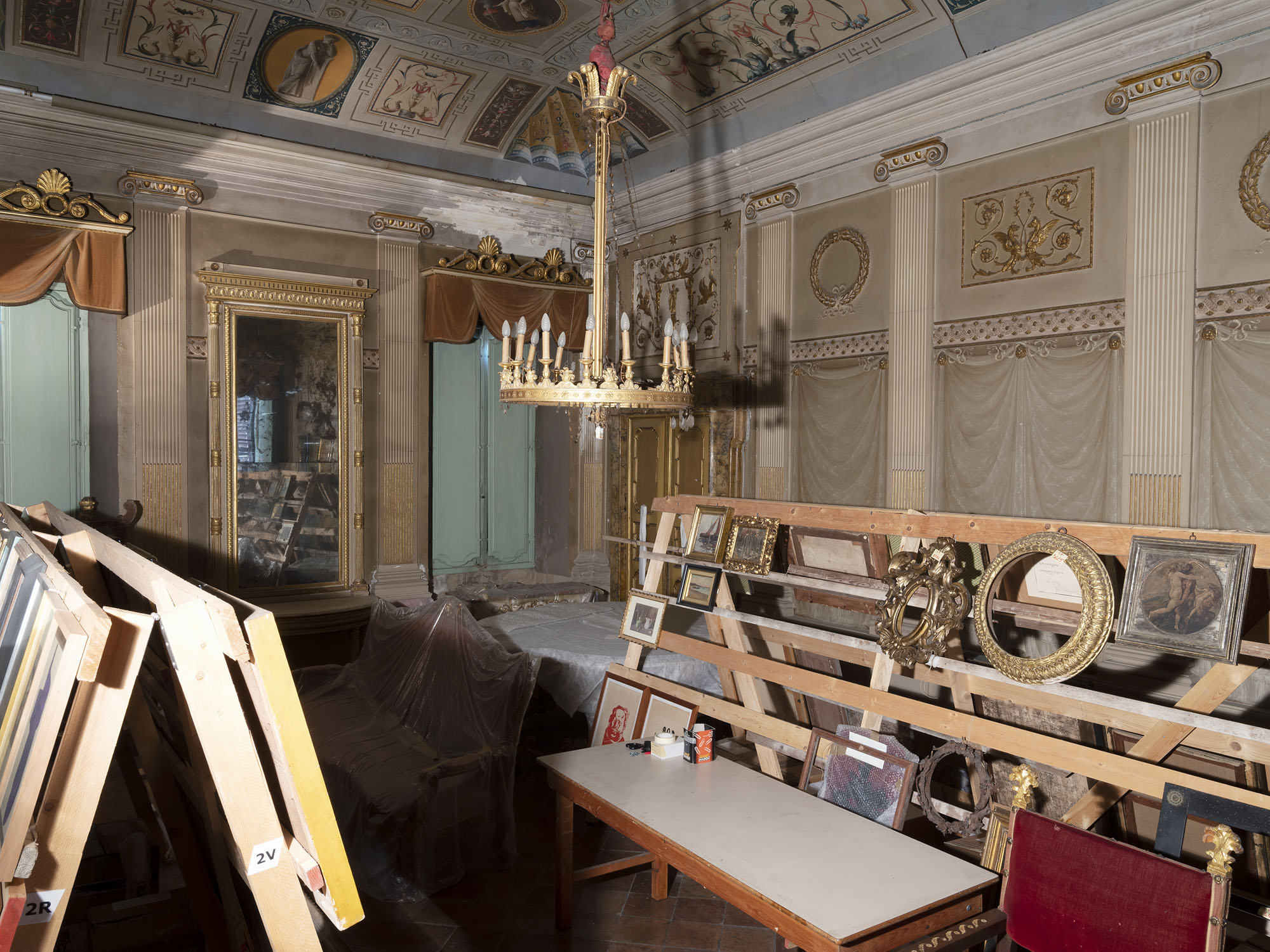 Nel Loggiato il percorso si fa ancora più articolato. Il telo dell’ingresso prosegue lungo la parete vetrata filtrando la luce e producendo un’atmosfera lattiginosa. L’intervento architettonico, pensato dallo studio baukuh proprio per questo ambiente, costruisce la scena per le opere di Graziani: i ritratti di una serie di atleti in allenamento al Landskrona Idrottshall di Arne Jacobsen, posizionati a terra su basi in gommapiuma bianca, e sulla parete l’immagine delle conservatrici durante l’allestimento della mostra “Raffaello 1520-1483” e quella dei depositi dei Musei Civici di Pesaro a Palazzo Mosca, fotografati appositamente dall’artista con l’intento di attivare un dialogo aperto con il patrimonio artistico della città.