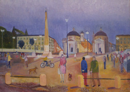 Stefano Guadagnoli. Il suo è un mondo pieno di personaggi. Scenografo, professore di educazione artistica, dipinge da molto tempo: piazze, architetture, spiagge, parchi di diverse città europee e anima questi luoghi con bambini che corrono, automobili, vespe, ragazzotti che giocano a pallone oppure con personaggi in costume che richiamano eventi storici o spettacoli teatrali. I luoghi non sono inventati; prima fotografati e studiati storicamente, poi ridipinti e animati con alcune semplificazioni e sproporzioni che rendono i quadri originali.