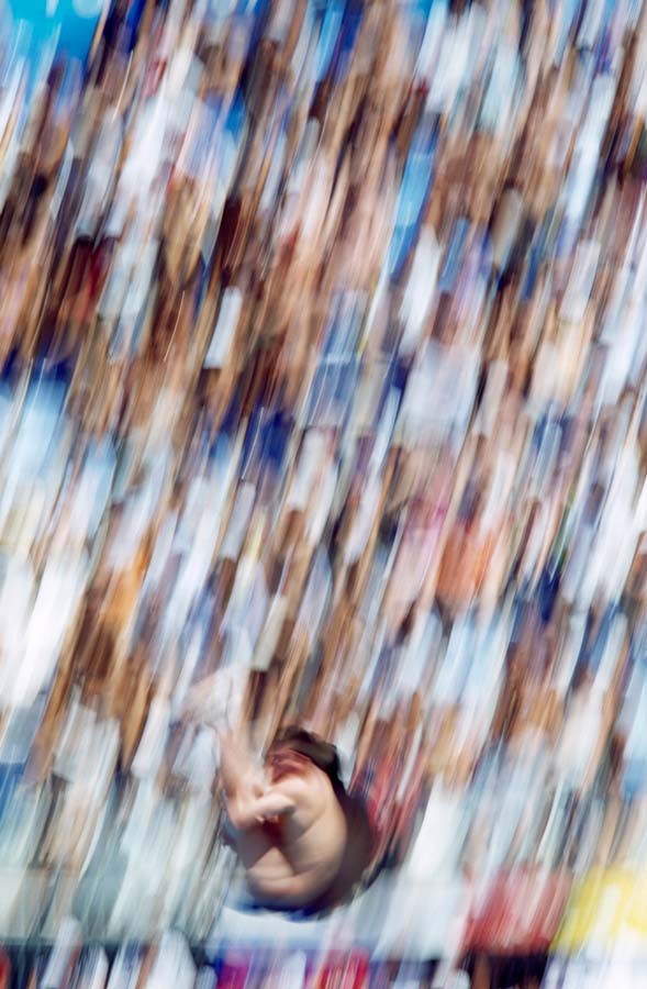 Il progetto “Piscine” prende corpo durante i Mondiali di Nuoto 2009, un evento sportivo e mediatico che ha visto nuotatori e tuffatori nello scenario marmoreo del Foro Italico. Nicolini era un fotografo accreditato, tra coloro che potevano avvicinarsi a vasche e trampolini per costruire immagini ad alta vibrazione figurativa. Un approccio coerente con l’attitudine naturalistica del settore. L’anomalia del viaggio liquido riguardava le posture orizzontali dei corpi in corsia, il rollare centripeto del tuffo, i verticalismi floreali del nuoto sincronizzato, la natura mineralizzata dell’acqua trasparente. Ma riguardava anche l’incastro tra acqua e cielo, l’equilibrio tra strutture artificiali e corpi agonistici, la tessitura filamentosa dei contrasti luminosi, i dialoghi tra piani e fondali.