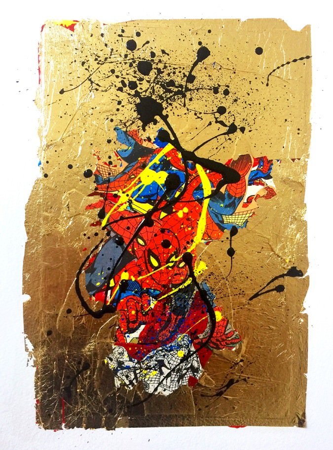 Le nuove opere polimateriche hanno come soggetto l’Uomo Ragno nella versione disegnata da Steve Ditko negli anni ’70 e sono caratterizzate dall’utilizzo della foglia d’oro, applicata su carte pregiate delle cartiere Fedrigoni.