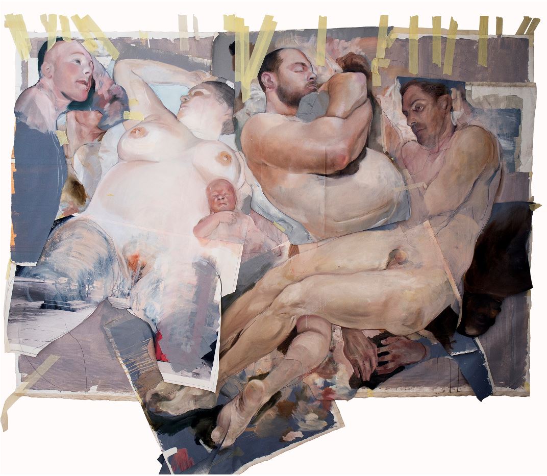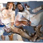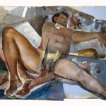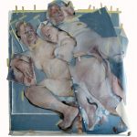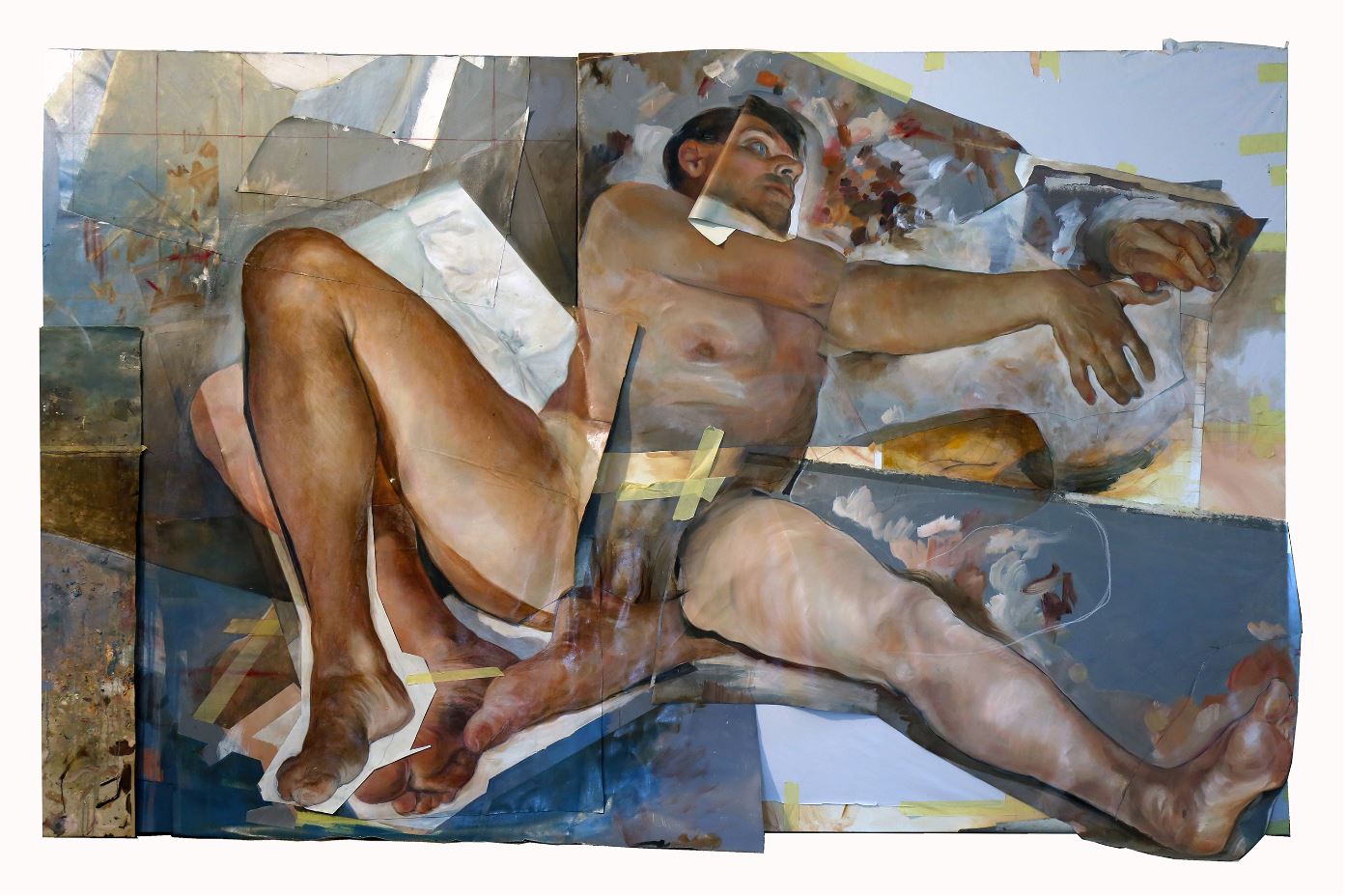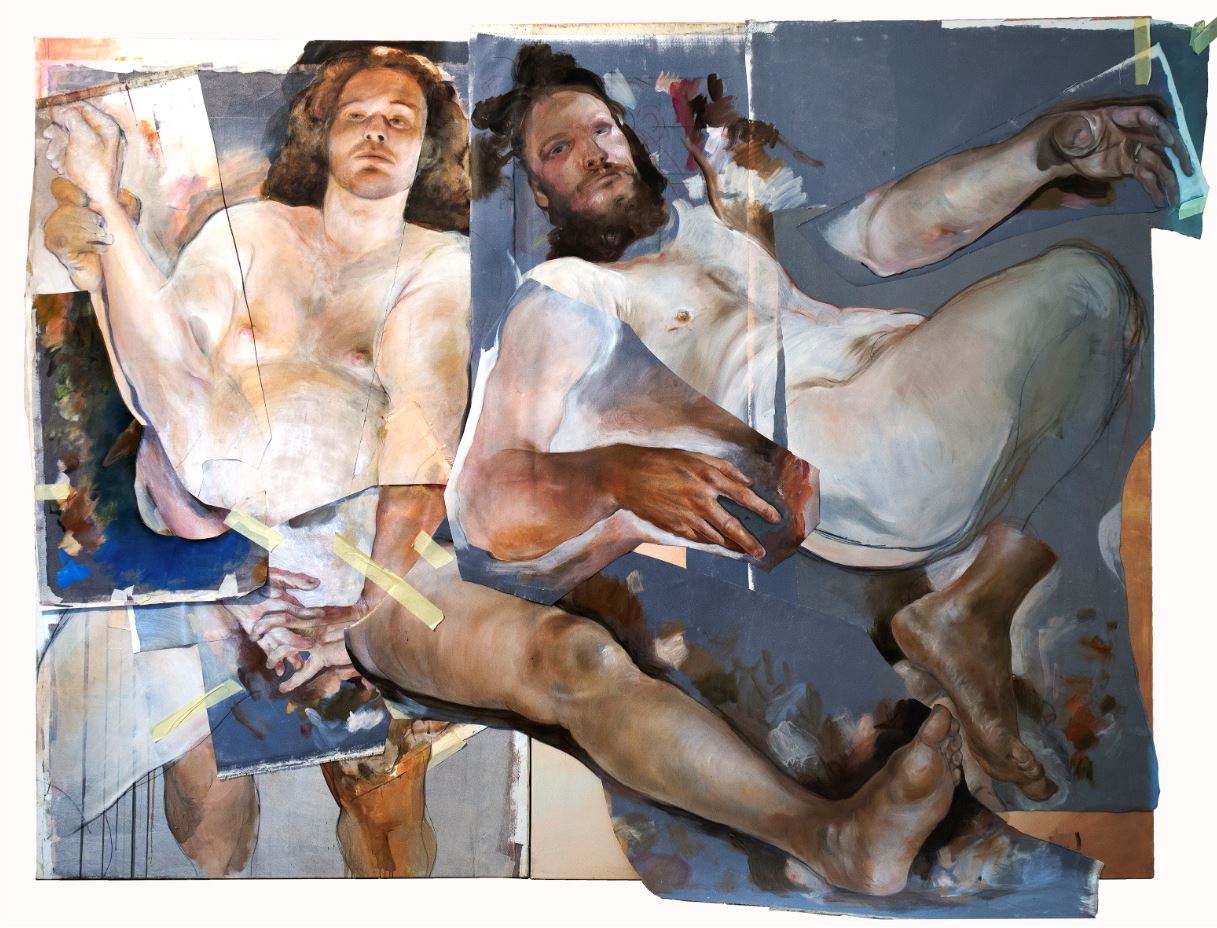 L’artista dipinge corpi nudi applicando alla tela ulteriori porzioni di tela. Per realizzare questo “collage” di stratificazioni utilizza lo scotch, un materiale contemporaneo di largo consumo che crea una interessante frizione con la plasticità classica del dipinto.