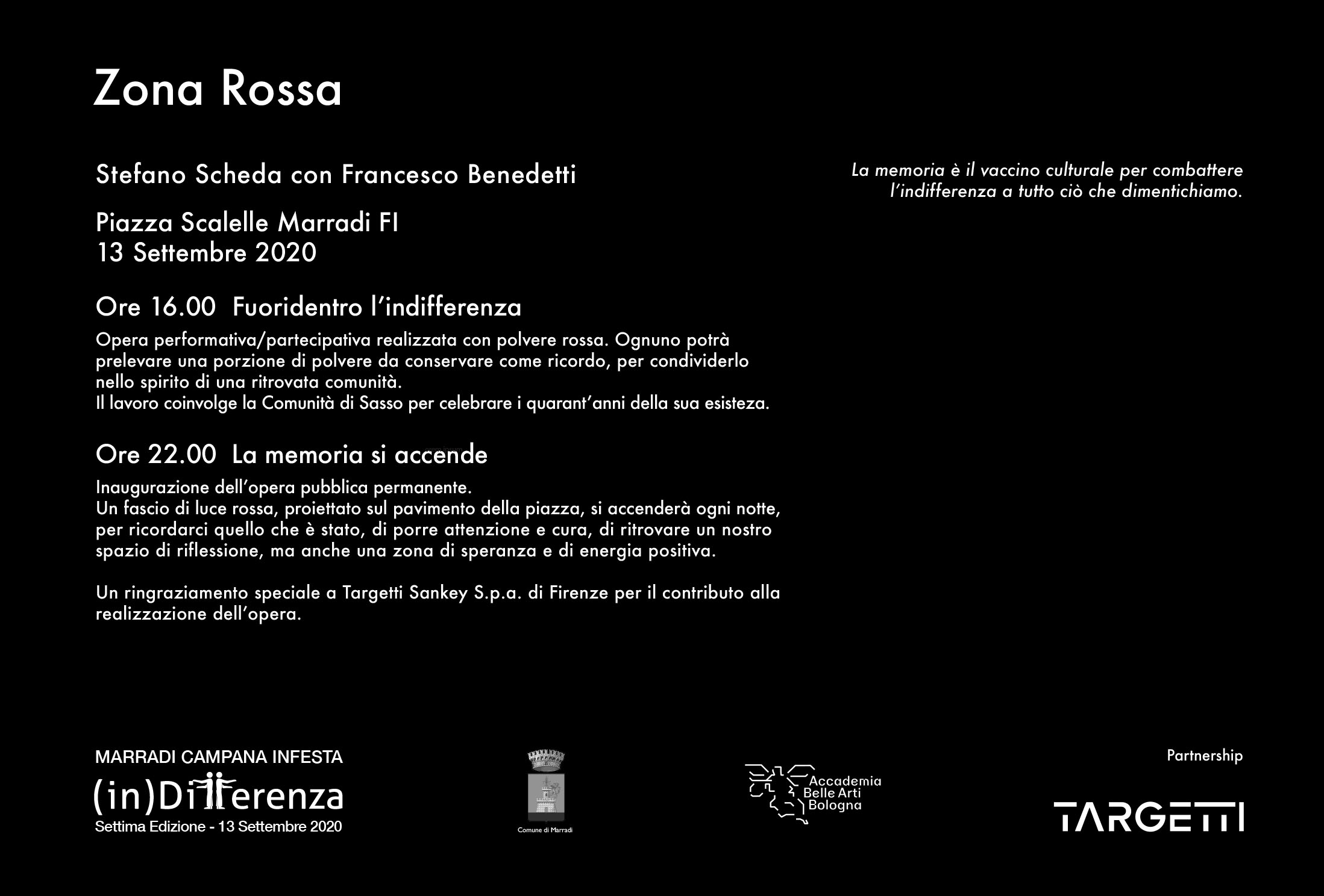Stefano Scheda con Francesco Benedetti in un’opera performativa/partecipativa realizzata con polvere rossa, che ognuno potrà prelevare e conservare, come ricordo. Inaugurazione dell’opera pubblica permanente: un fascio di luce rossa si accenderà ogni notte per riflettere sulla memoria.