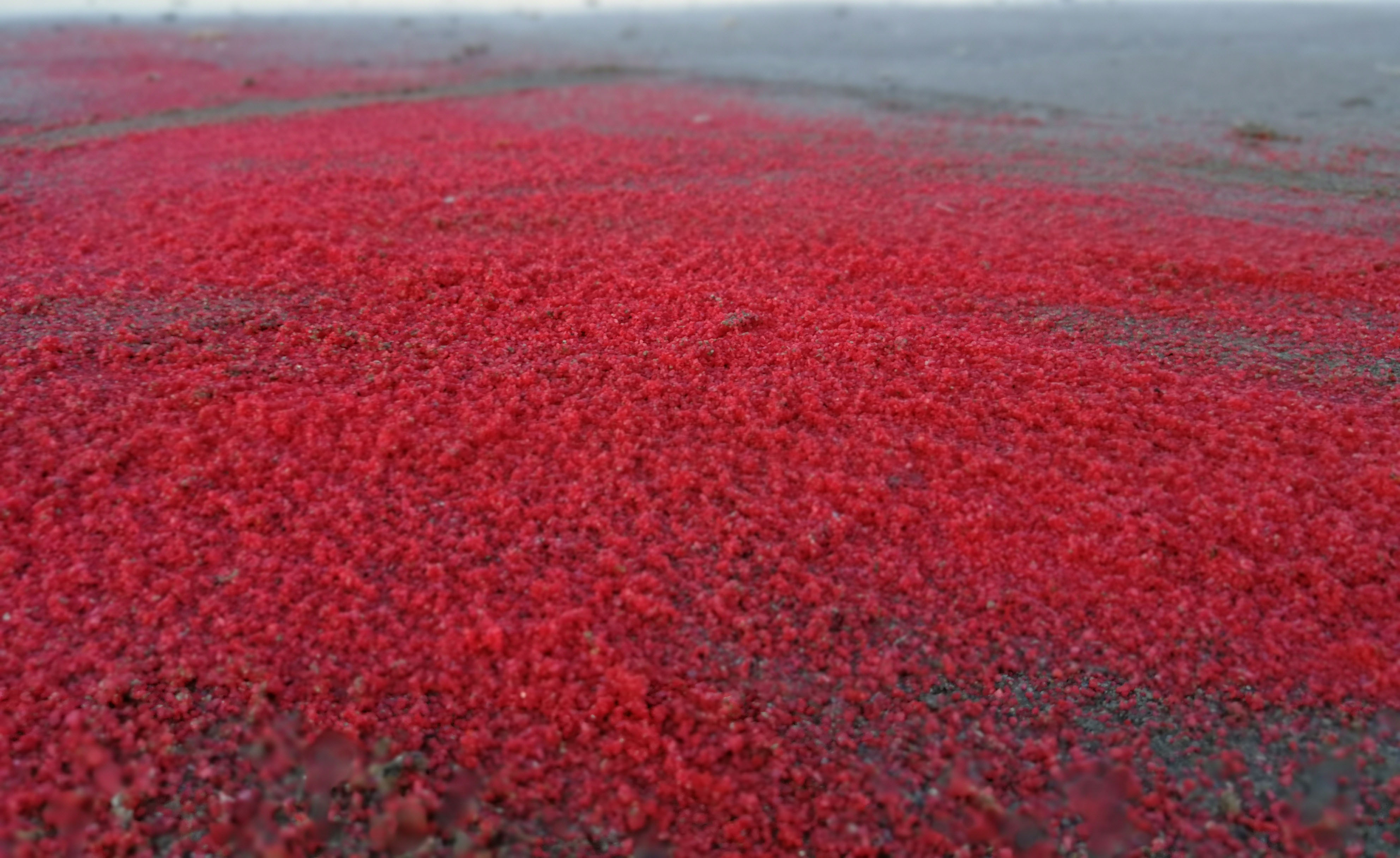Sulla piazza centrale di Marradi una polvere rossa crea un area circolare.