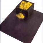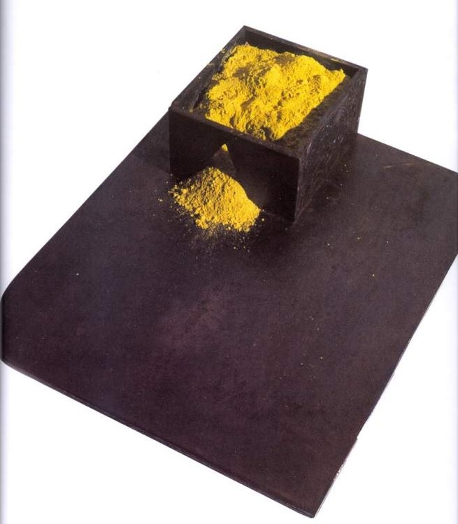 Anima gialla, esposta per la prima volta nel 2004 all’Istituto Italiano di Cultura di Bruxelles e successivamente presso la Galleria Biffi di Piacenza, è posizionata al centro della sala inferiore della chiesa di San Sisto ma ugualmente visibile dal piano superiore: si tratta di una scultura imponente (cm 200x160) composta da 68 formelle quadrate in acciaio disposte una accanto all’altra sul pavimento intorno ad un contenitore, sempre in acciaio, colmo di polvere di pigmenti gialli.