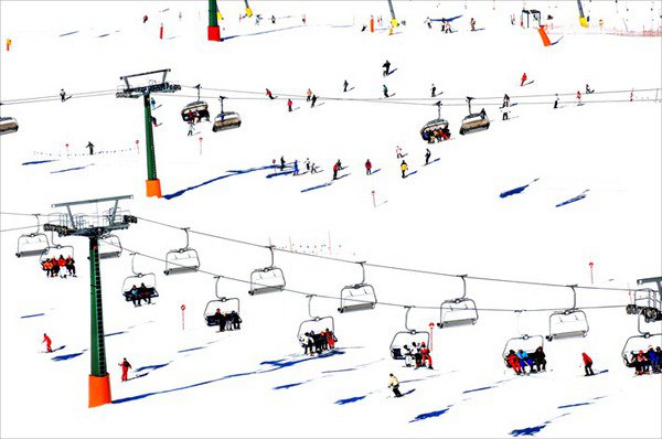 Una sintesi assoluta di elementi, di colori, di persone e delle loro ombre, del divertimento collettivo dove anche gli impianti di risalita, una volta considerati oggetti sacrileghi nell'ambiente montano, diventano parte integrante del divertimento, quindi totalmente assolti.