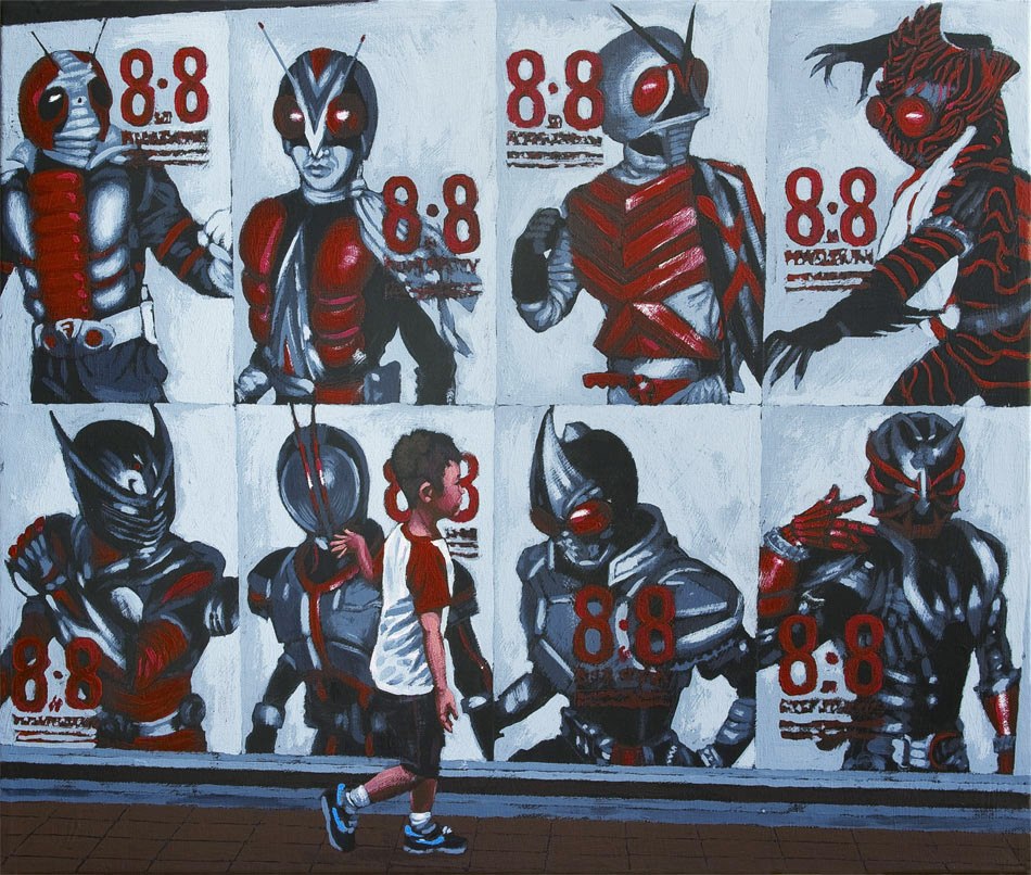 Passeggiando per Tokyo ci si imbatte in situazioni in cui Manga ed Anime non decorano semplicemente la realtà, ma entrano a farne parte. Tecnologia, tradizione e cultura pop si fondono in una texture che riveste la città di un abito sgargiante. Una trama di corti circuiti culturali, di combinazioni mediali che risultano surreali ad uno sguardo occidentale, educato alla settorialità dei generi. All'apparenza metafisiche, queste rappresentazioni della capitale nipponica sono tratte da immagini catturate in presa diretta. Una selezione dei ritagli di città, dove l'irreale sembra prendere il sopravvento sul reale. Scorci dove entità fantastiche sembrano aver trovato il varco dimensionale per invadere la quotidianità.