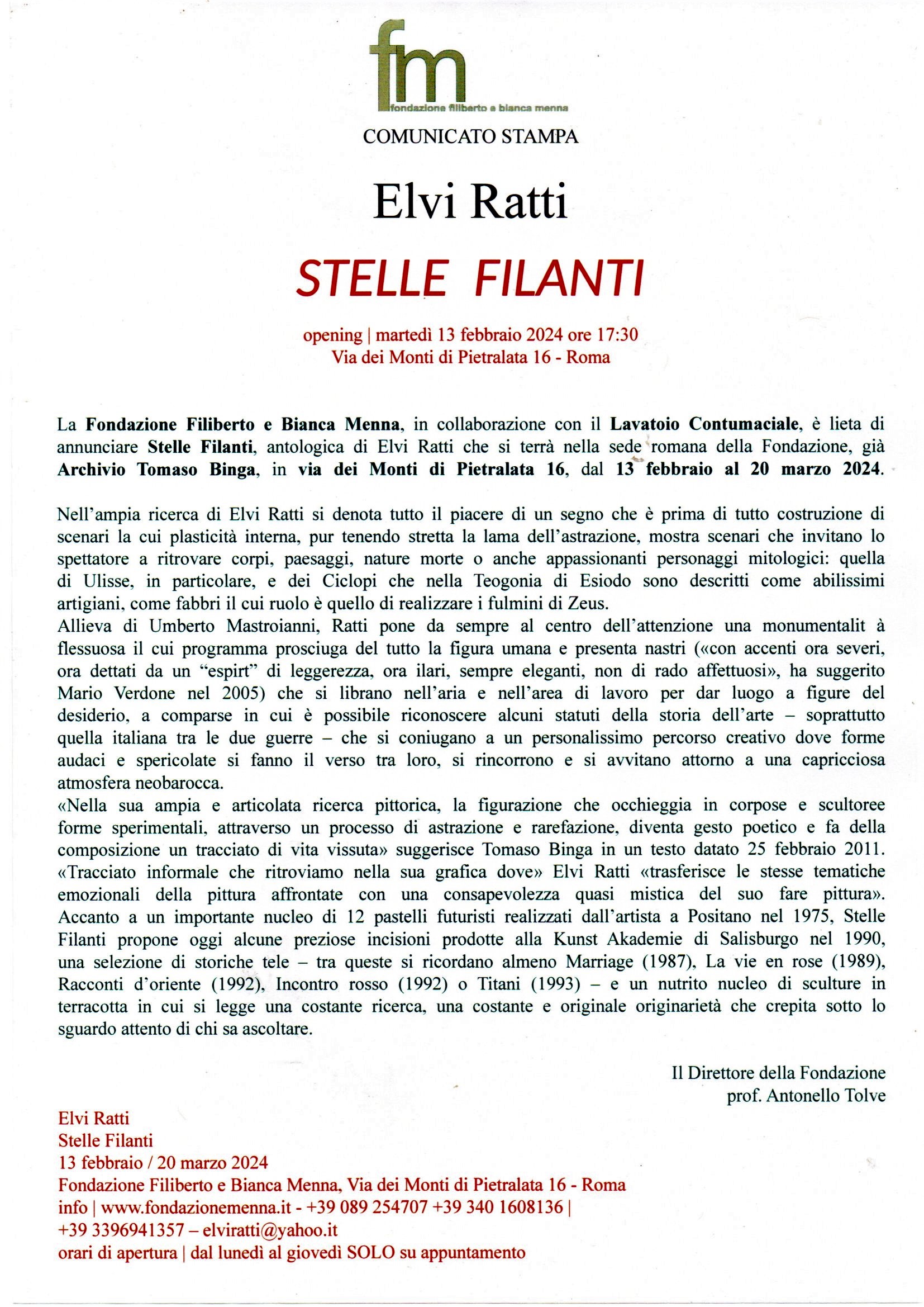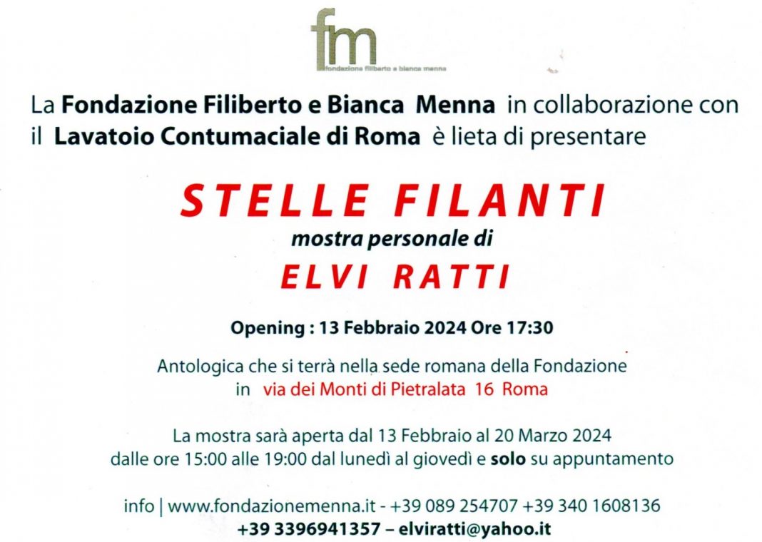 La FONDAZIONE FILIBERTO e BIANCA MENNA, in collaborazione con il LAVATOIO CONTUMACIALE, è lieta di annunciare STELLE FILANTI, antologica di ELVI RATTI che si terrà nella sede romanda della Fondazione già ARCHIVIO TOMASO BINGA, in VIA DEI MONTI DI PIETRALATA 16, dal 13 febbraio al 20 marzo 2024.