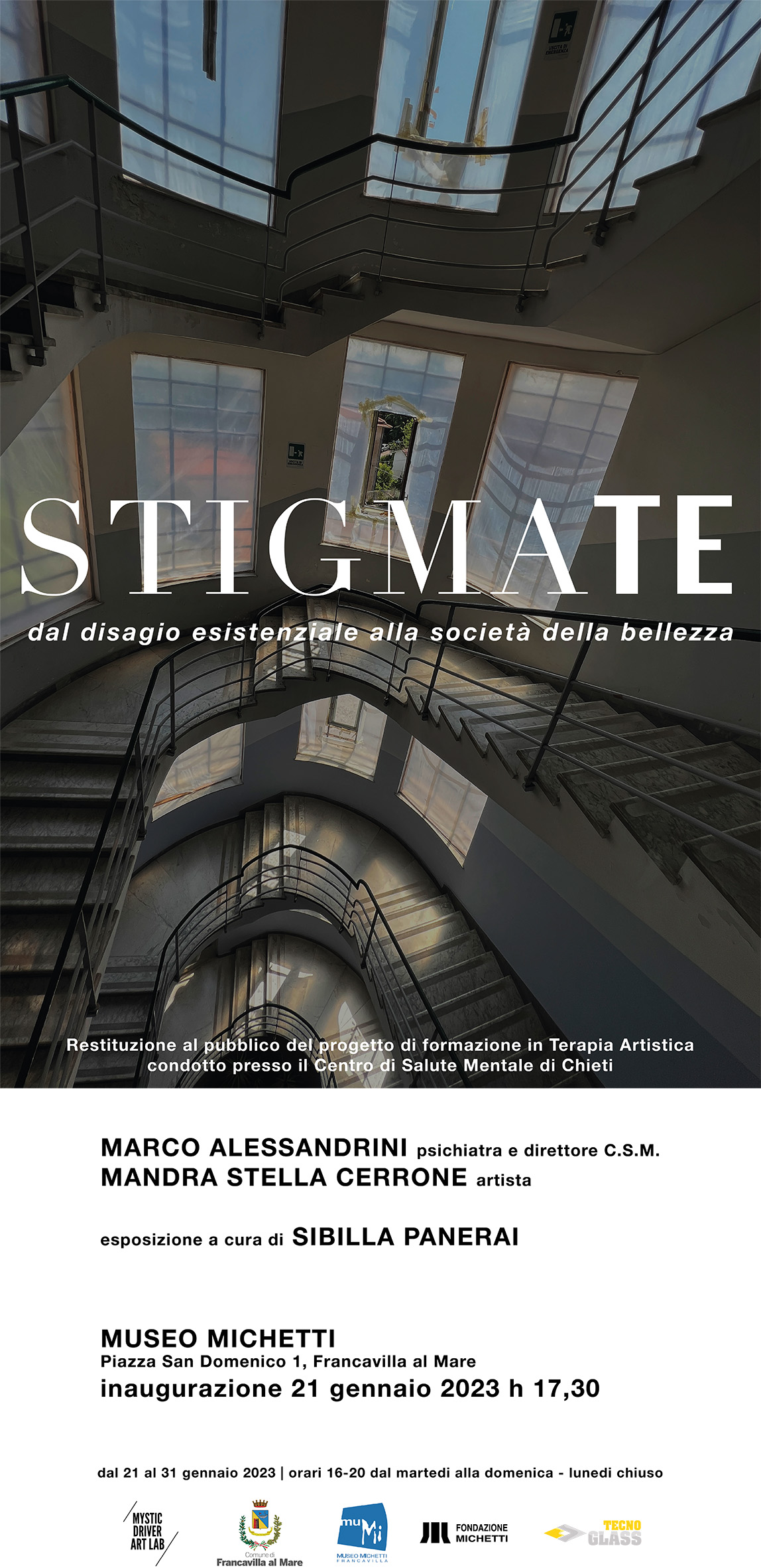 Inaugura sabato 21 gennaio al Museo Michetti (Piazza S. Domenico 1, Francavilla al Mare) alle 17.30 l’esposizione StigmaTe, che nasce da un progetto di formazione in terapia artistica condotto dall’artista e performer Mandra Stella Cerrone presso il Centro di Salute Mentale di Chieti sotto la supervisione del suo direttore, lo psichiatra e psicoanalista Marco Alessandrini. La mostra, a cura della professoressa Sibilla Panerai (Università G. d’Annunzio, Pescara), restituisce al pubblico quanto accaduto nei sei mesi di laboratori svoltisi da luglio a dicembre 2022 e si pone quale punto di riflessione sullo stigma legato ai disturbi della sfera mentale ed emotiva e sul rapporto che intercorre tra benessere collettivo e personale.